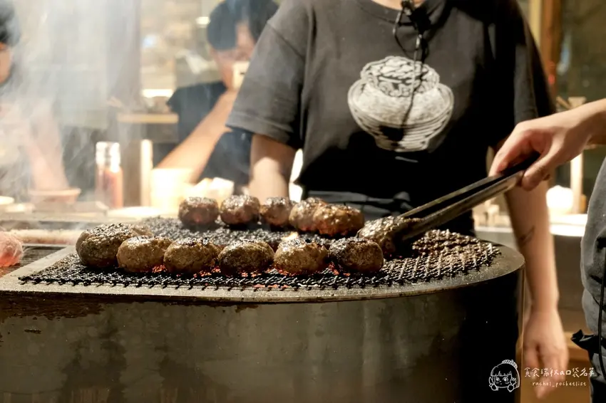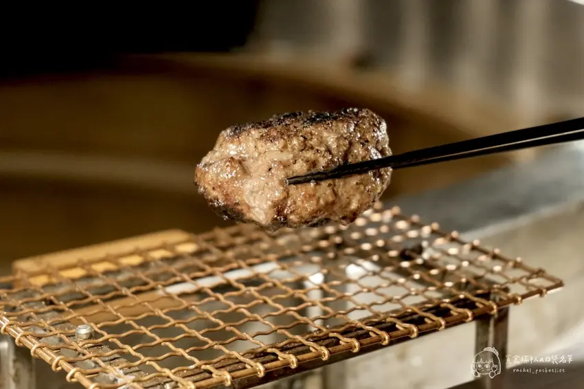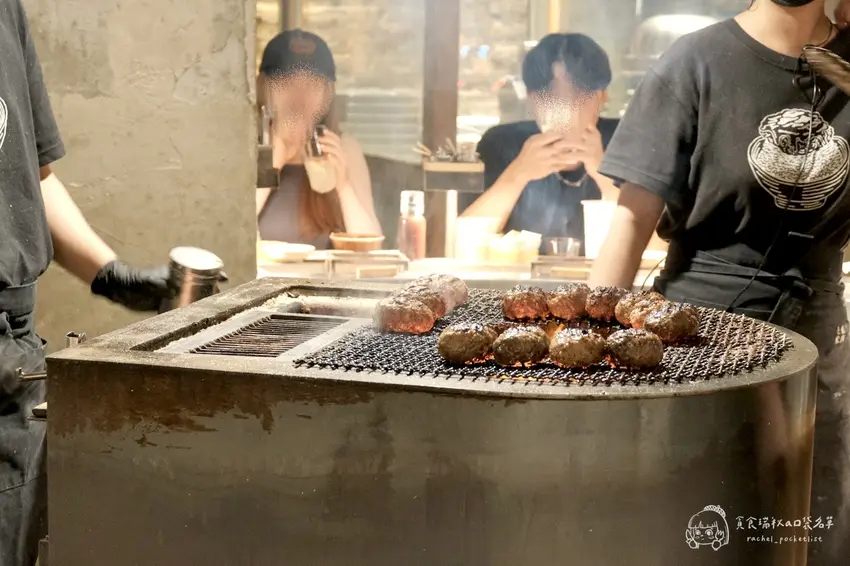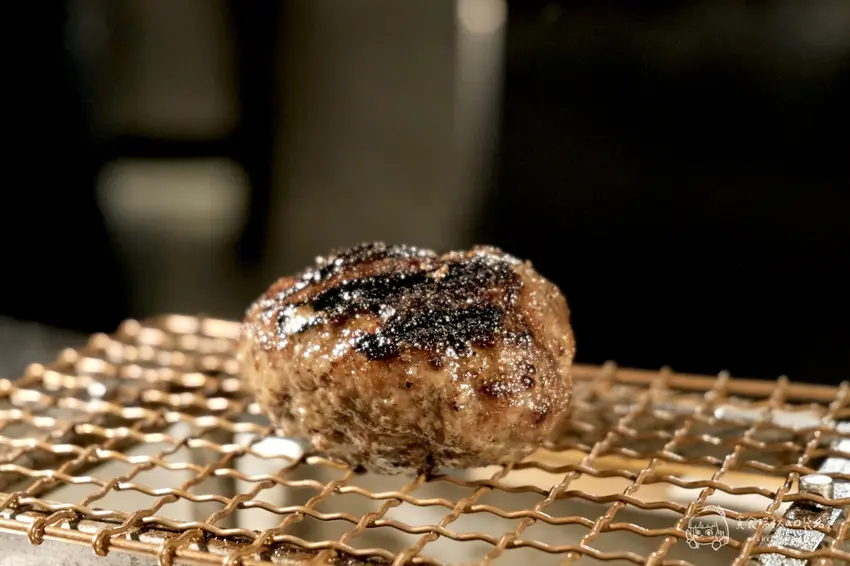 挽肉と米的核心理念在於對新鮮度的極致追求,每天早上在店內現絞 100% 純和牛絞肉,確保肉質的鮮美。店內採用全透明的料理區域設計,讓顧客坐在工業風的吧台座位上,就能近距離欣賞師傅用大火炭烤漢堡排的過程。看著厚實的肉排在炭火上滋滋作響,外層烤至微焦、內裡鎖住飽滿肉汁,視覺與嗅覺的雙重享受讓人食慾大開。剛烤好的漢堡排會直接放在顧客面前的烤網上,油亮誘人的光澤彷彿在召喚著你快點開動。