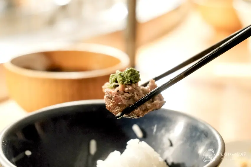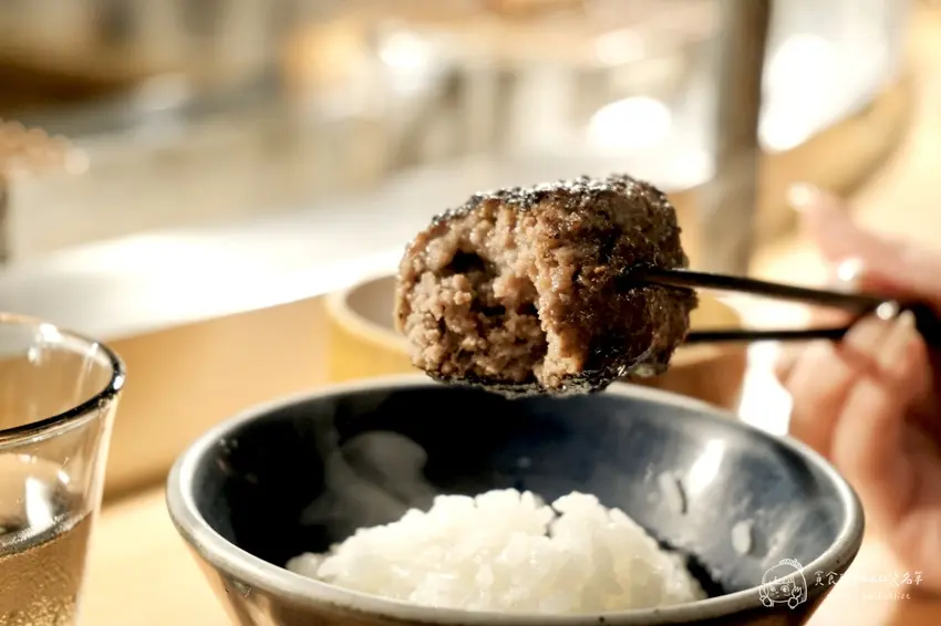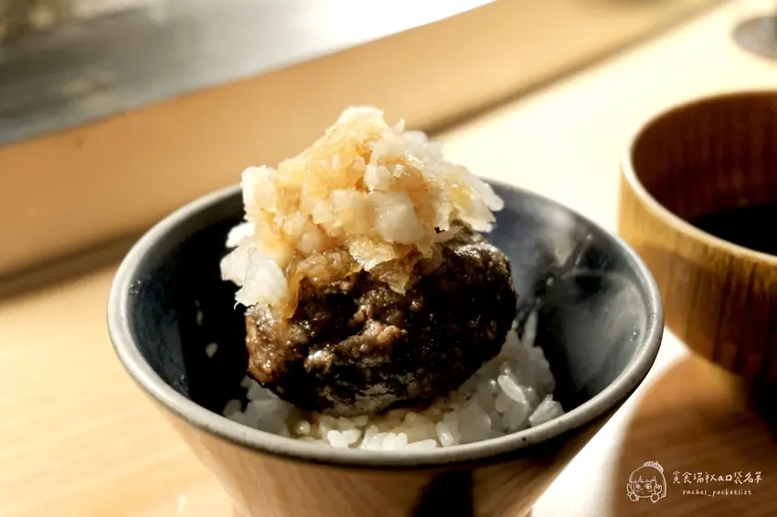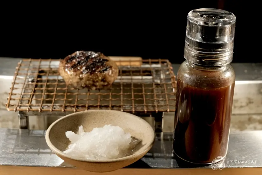 店家推薦的漢堡排三種吃法,能讓味蕾體驗不同的層次。第一塊漢堡排強烈建議「什麼都不要加」,直接大口咬下。這時能最直接地感受到炭火燻烤的香氣,以及和牛特有的豐沛肉汁在口中爆開的瞬間。雖然是油脂豐富的和牛,但透過炭火逼出的油脂與瘦肉比例恰到好處,吃起來完全沒有過多的油膩感,只有滿滿的肉香與鮮甜,讓人驚豔於單純食材所帶來的強大衝擊力。