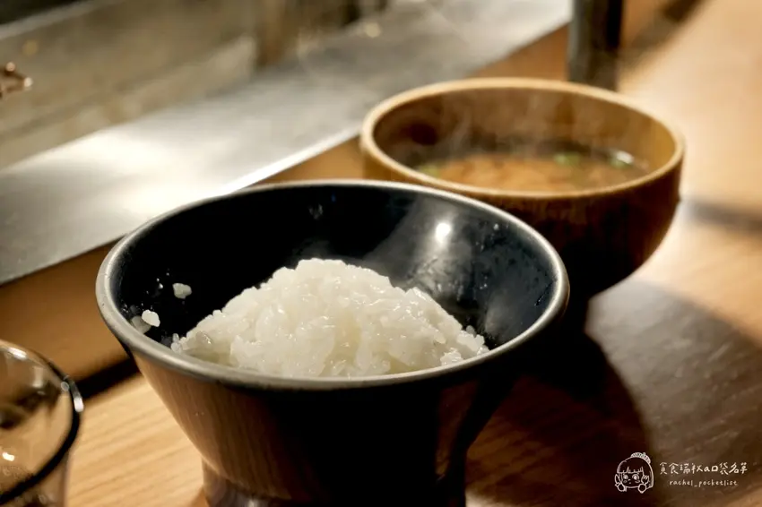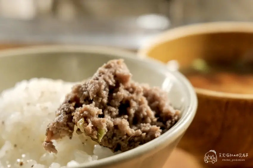 在挽肉と米,白飯的地位與漢堡排同等重要。店家使用大型羽釜鍋現煮日本米,煮出來的白飯粒粒分明、口感 Q 彈,本身就帶有迷人的米香。套餐內包含三顆 90g 的和牛漢堡排、味噌湯、無限續碗的現煮白飯以及一顆生雞蛋。為了讓顧客隨時都能吃到熱騰騰的米飯,服務人員會隨時注意顧客的碗底,並熱情地提供續飯服務。那種米飯吸附了和牛油脂後的香甜滋味,是整份套餐中不可或缺的靈魂配角。