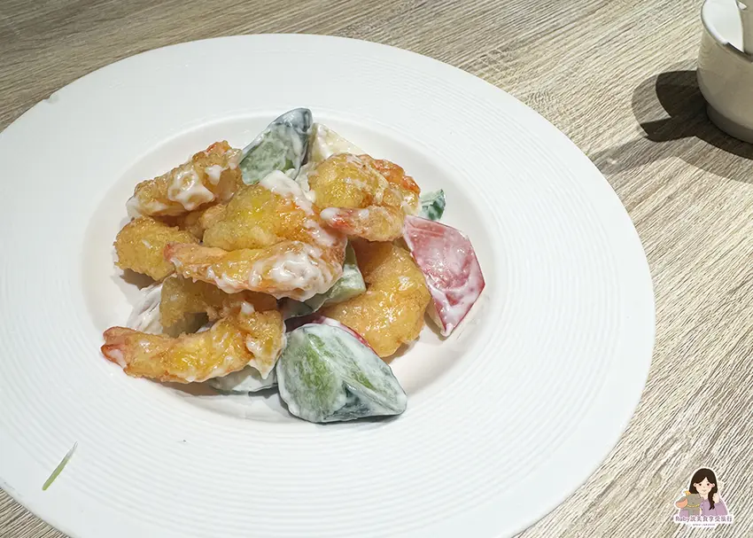 蝦球炸得酥脆,小黃瓜與蘋果、裹上沙拉醬,