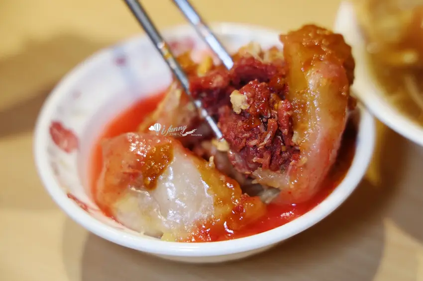 店內的招牌「油炸肉圓」採用傳統的低溫油泡方式烹調,這種料理手法能使米漿製成的外皮呈現極具咬勁的彈性,外層滑溜且帶有淡淡的豬油香氣。內餡部分給得毫不手軟,選用紅糟醃漬的豬肉塊,經過油泡後鎖住了飽滿肉汁,口感紮實鮮美。搭配脆口的筍絲,形成強烈的口感對比。最後淋上店家特製的蒜泥與甜辣醬,鹹香醬汁與紅糟肉的甜味在口中爆發,是老饕們心目中無可取代的經典滋味。