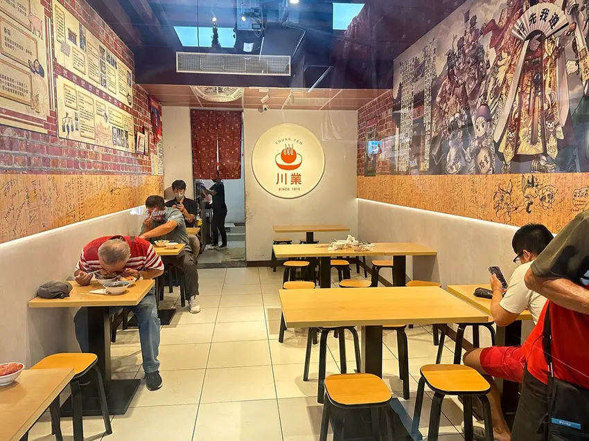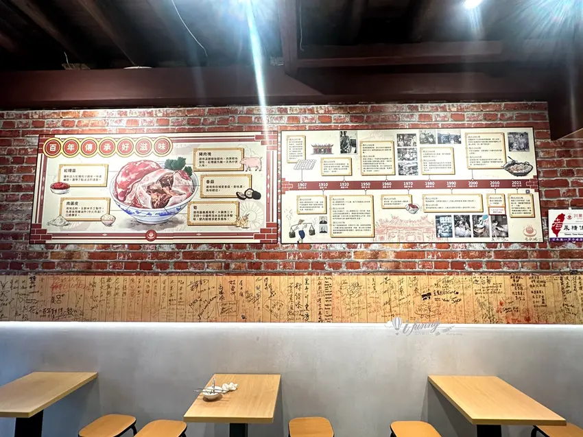 川業肉圓的店面經過翻新後,呈現出乾淨明亮的文青風格,長條形的空間前方為半開放式廚房,後方則是設有冷氣的舒適座位區。牆面上詳細記載了店家百年來的演進歷史,以及許多政商名流的親筆簽名,見證了其在美食界的地位。店內裝飾更巧妙結合了艋舺當地的信仰與祭典活動,增添了濃郁的在地人情味。雖然是老店,但在環境衛生與用餐氛圍上都與時俱進,讓顧客能在最舒適的環境下,細細品味這傳承四代的經典好味道。