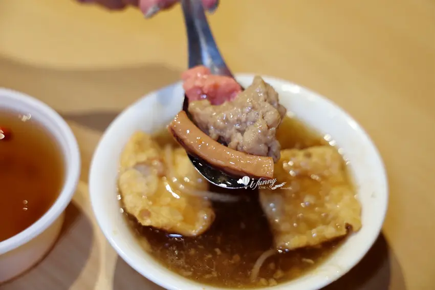 來到這裡,除了肉圓之外,湯品也是不容錯過的配角。「綜合羹」是店內的人氣湯品,一碗就能滿足貪心的味蕾。湯裡匯集了爽脆的魷魚、紮實的肉羹、彈牙的蝦仁以及酥香的魚酥,用料相當實在豐富。羹湯勾芡濃稠度適中,加入了不少筍絲增加口感層次,並帶有濃郁的蒜味提鮮。喝上一口熱騰騰的羹湯,搭配口味較重的肉圓,剛好形成完美的互補,是許多老顧客指名的標準套餐組合。