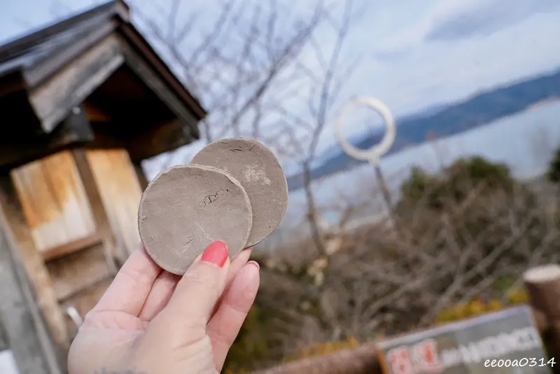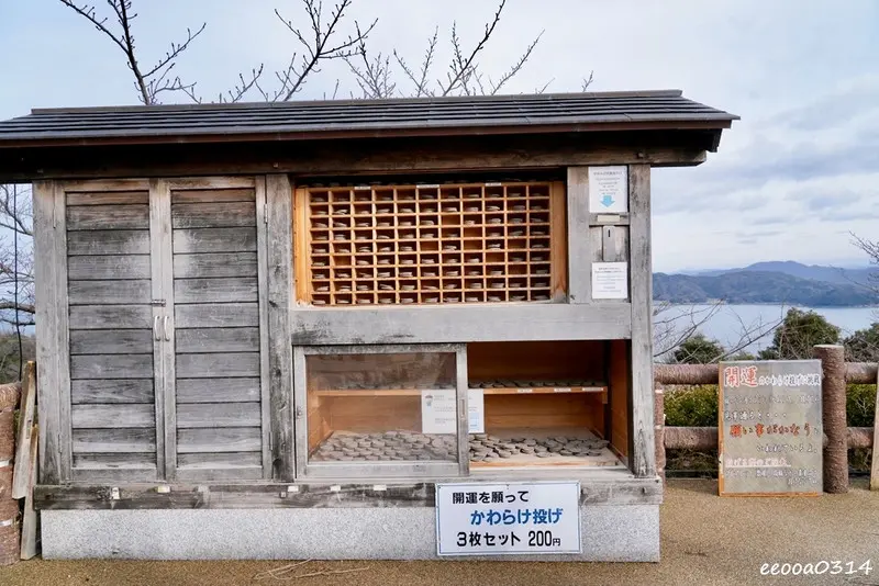 一份3片200日圓,試著瞄準山坡下的圓形鐵圈投擲,聽說只要能順利穿過鐵圈,願望就能成真,還能消災解厄!