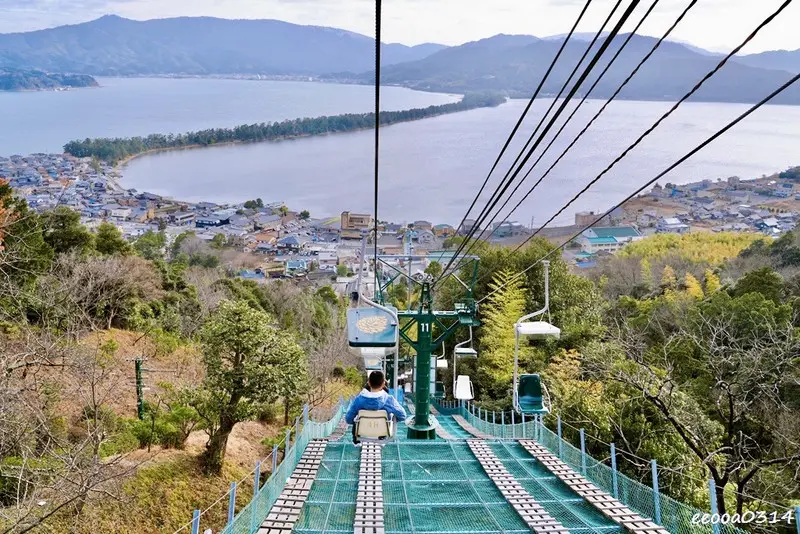 下山時我們搭乘的是露天單人吊椅,沒有玻璃遮擋,視野完全敞開,天橋立沙洲、日本海的顏色,全都毫不保留地映入眼簾。