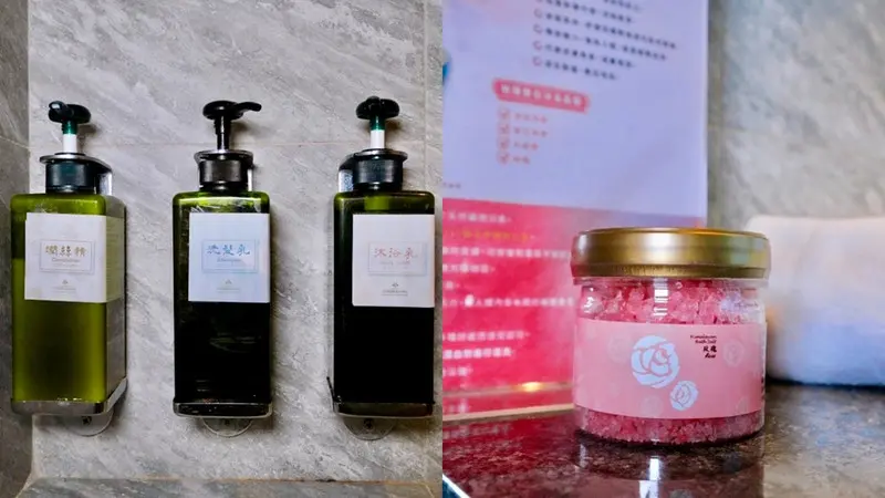 淋浴間牆面備有大瓶裝的洗髮乳、潤髮乳及沐浴乳。另外,還有寶石沐浴晶鹽,可以享受充滿香氛的療癒時光。