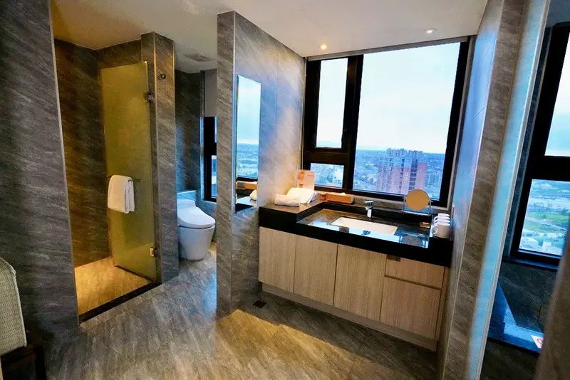 衛浴空間設計極具質感,結合了現代灰調石紋牆面與大片景觀窗,讓盥洗也成為一種感官享受。