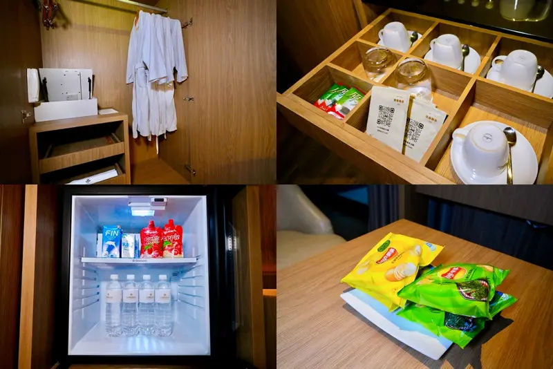 Mini Bar擺放著咖啡杯組、玻璃杯以及精選茶包與濾掛式咖啡,還有免費飲料與零食。