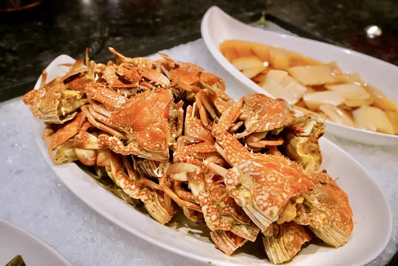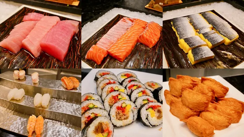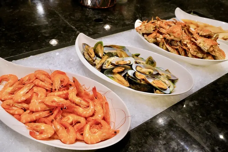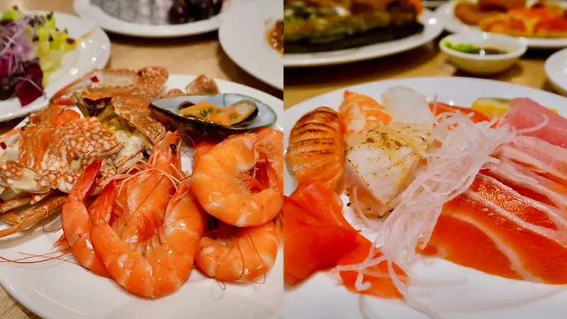 海鮮控絕對不能錯過這裡的低溫冰鎮海鮮區,有鮮蝦、螃蟹與淡菜等,日料生鮮區則是現切生魚片,當天有鮭魚、旗魚和黃金鯡魚,切得不小氣。