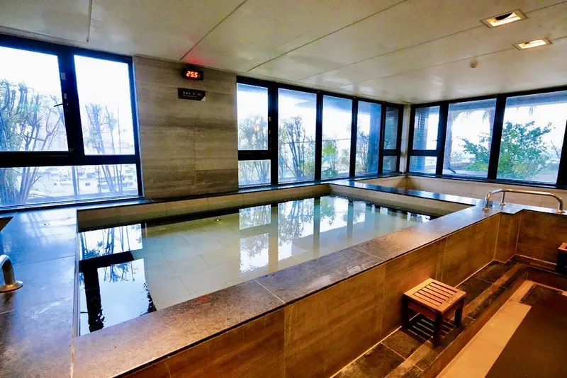 寬敞的石造浴池緊鄰大面積落地窗,雙湯池分別為碳酸氫鈉泉(美人湯)與寶石沐浴晶鹽兩種湯池設計。