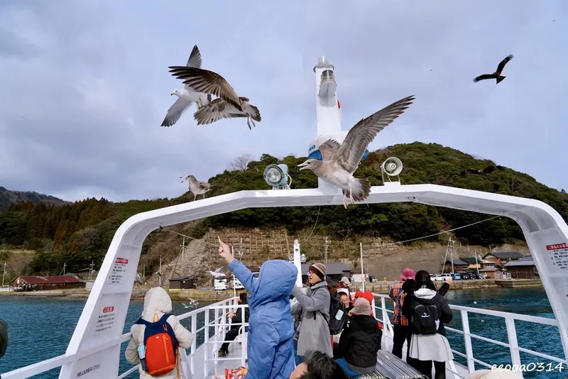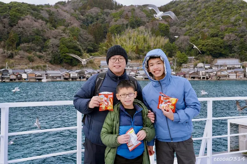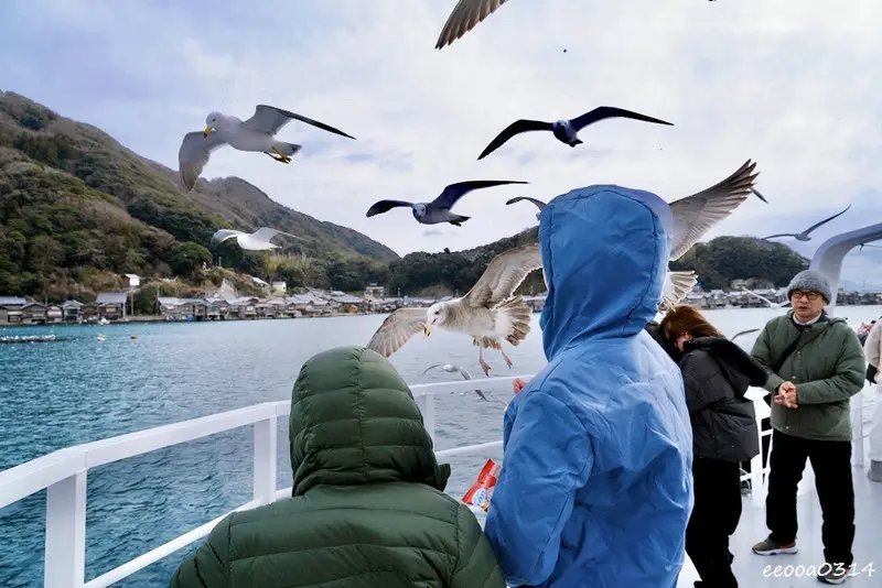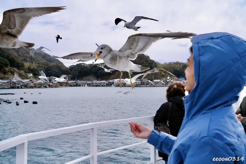 整趟航程大約25 分鐘,可以從海上角度欣賞整個舟屋聚落,是用走的看不到的視角,還有最有名的活動「餵海鳥」,在購票處可以購買蝦味先來餵食海鳥。