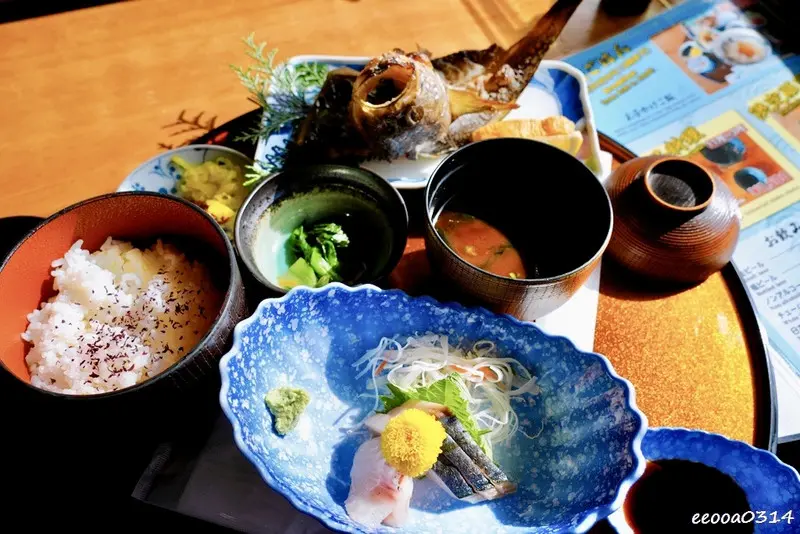 烤魚套餐:烤魚搭配白飯以及刺身,還有小菜及味噌湯,魚皮焦香、肉質細緻,展現了最純粹的在地鮮味。