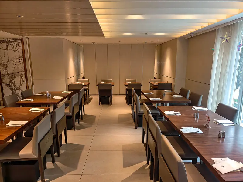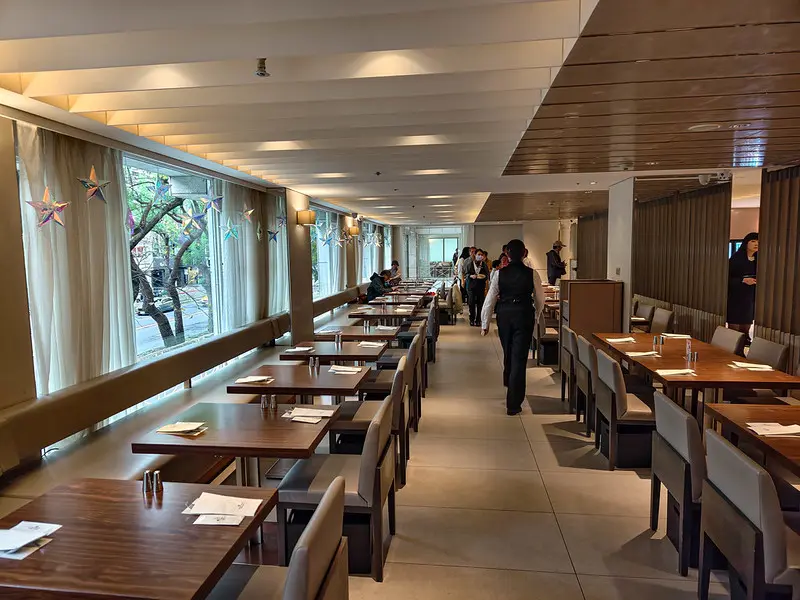 Le Café 的環境是許多老饕喜愛這裡的原因之一。位於二樓的餐廳擁有極佳的採光,透過落地窗可以欣賞中山北路迷人的林蔭景色。雖然座位數不少,但桌距拿捏得宜,不會有一般吃到飽餐廳那種擁擠吵雜的市場感。取餐動線設計為長條形搭配中島區,雖然範圍不大,但動線規劃流暢,補菜速度也相當快。在這裡用餐,你會不自覺地放慢節奏,細細品味每一道料理與優雅的氛圍。