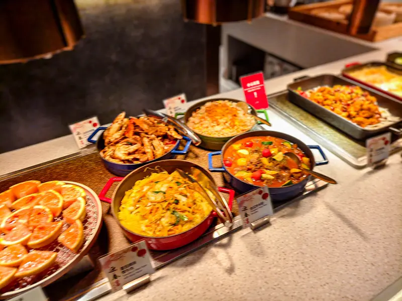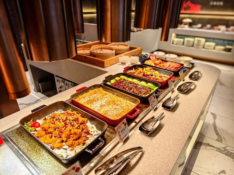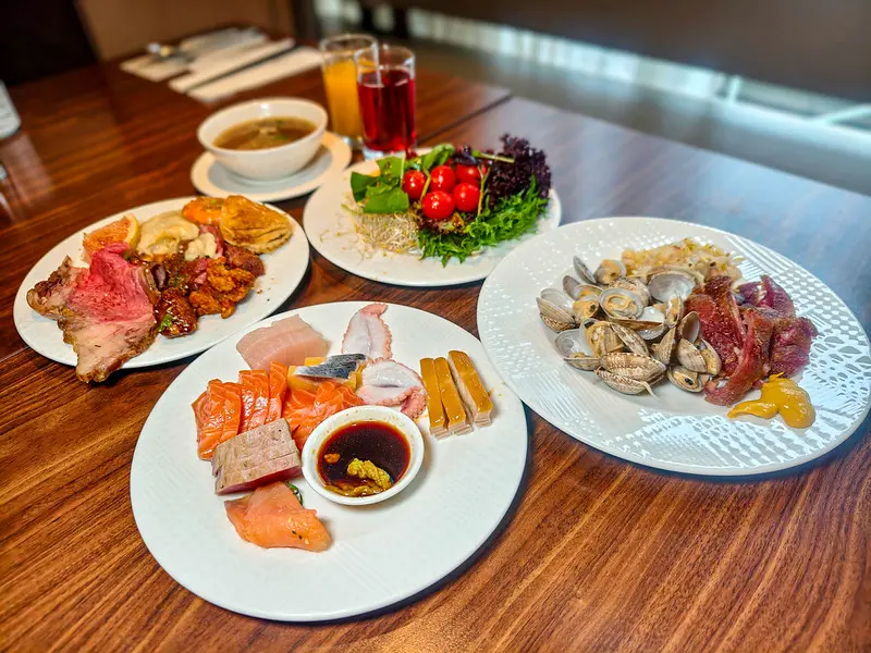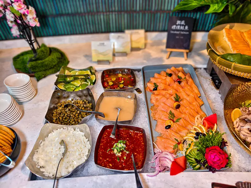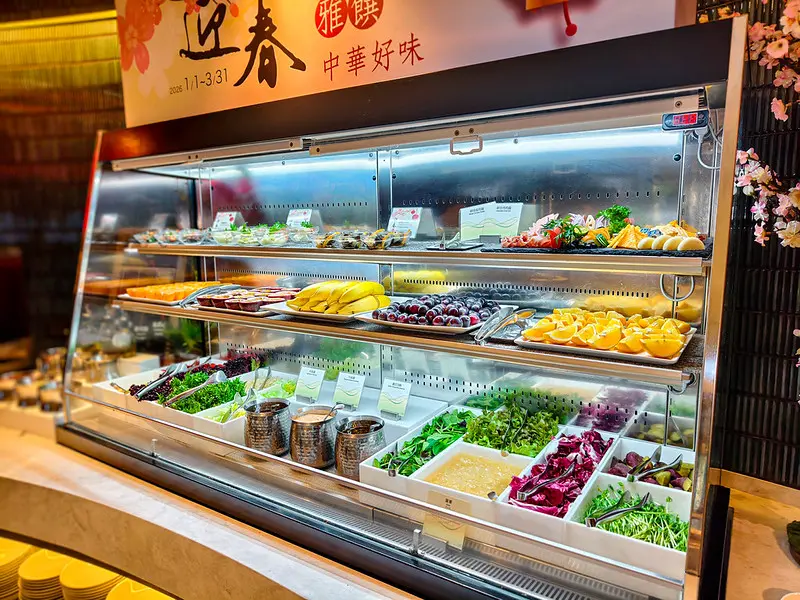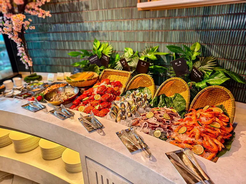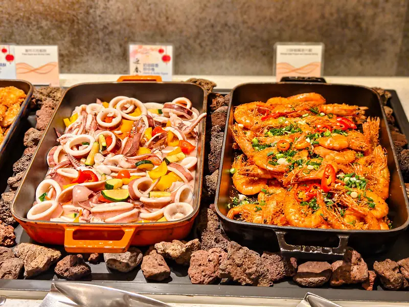 雖然很多人會跳過沙拉區,但這裡的蔬菜處理得非常乾淨,瀝水徹底,蘿美生菜咬下去爽脆有聲。冷盤海鮮區絕對是第一輪的重點,白蝦個頭雖非巨無霸,但新鮮度沒話說,剝殼時手感順暢,蝦肉彈牙鮮甜。配合中華主題推出的冷菜更是驚喜連連,「紹興醉雞」肉質紮實,皮肉間的凍帶著濃郁酒香;「涼拌海蜇皮」厚實脆口,搭配蒜味醬汁非常開胃。煙燻鮭魚油脂豐富,擠點檸檬汁解膩又美味。
