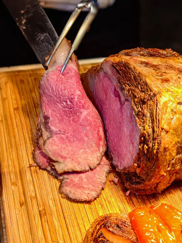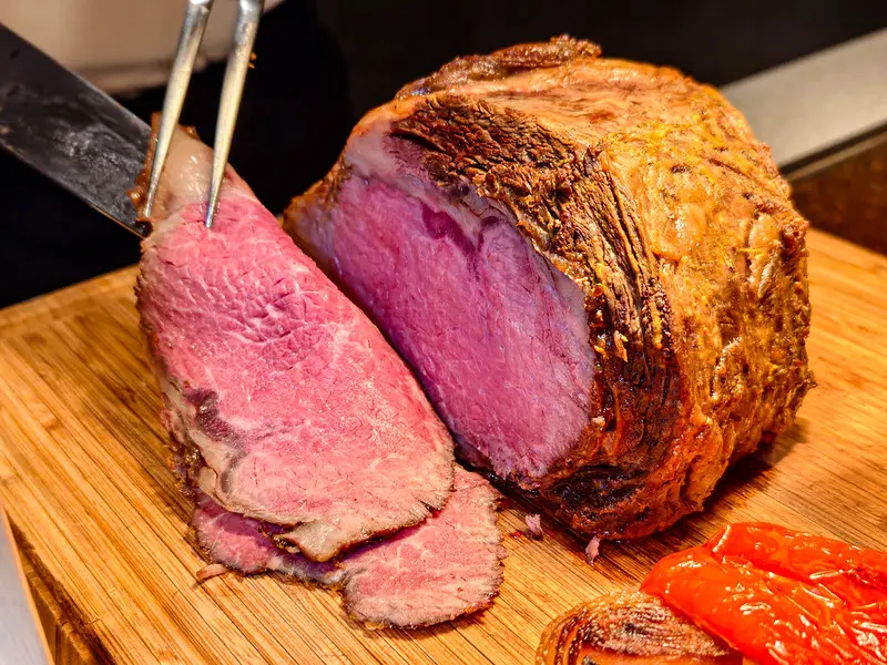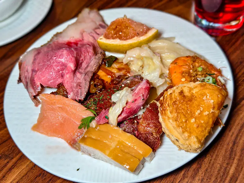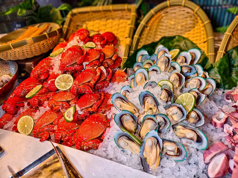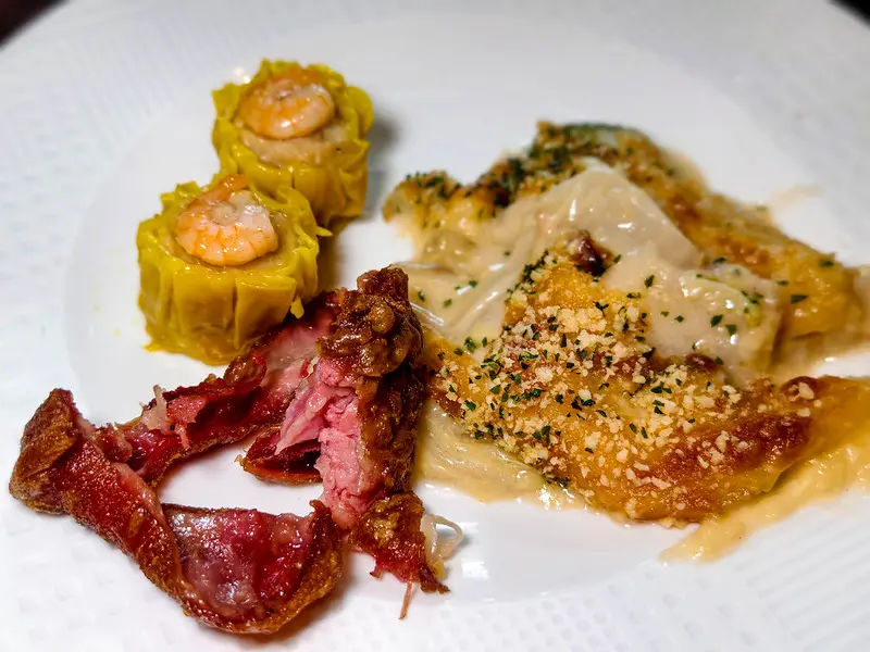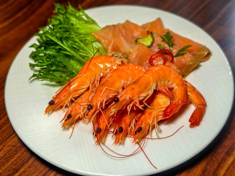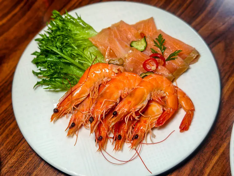 雖然很多人會跳過沙拉區,但這裡的蔬菜處理得非常乾淨,瀝水徹底,蘿美生菜咬下去爽脆有聲。冷盤海鮮區絕對是第一輪的重點,白蝦個頭雖非巨無霸,但新鮮度沒話說,剝殼時手感順暢,蝦肉彈牙鮮甜。配合中華主題推出的冷菜更是驚喜連連,「紹興醉雞」肉質紮實,皮肉間的凍帶著濃郁酒香;「涼拌海蜇皮」厚實脆口,搭配蒜味醬汁非常開胃。煙燻鮭魚油脂豐富,擠點檸檬汁解膩又美味。