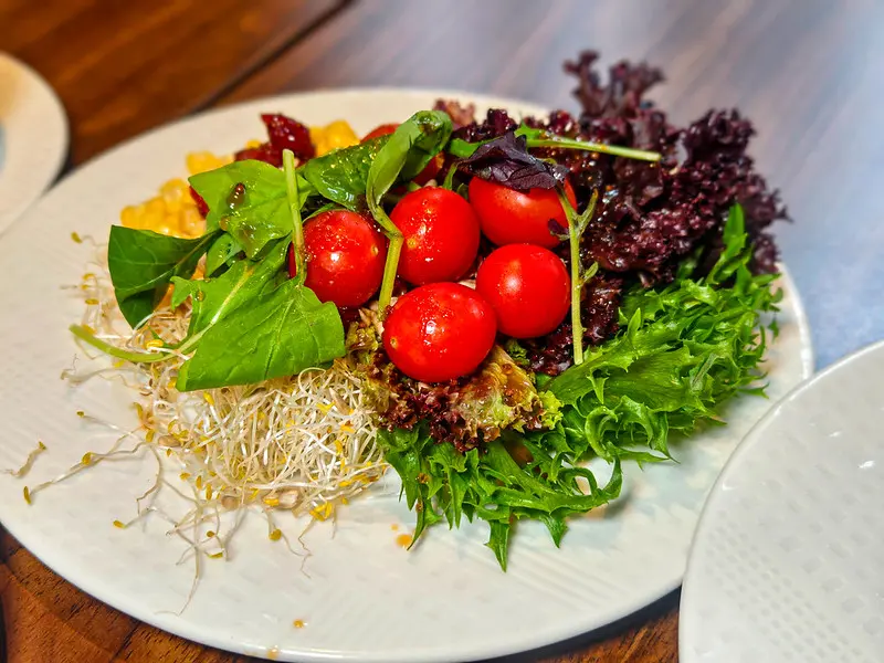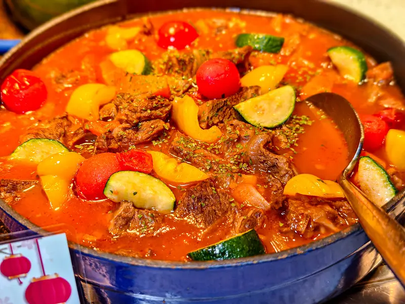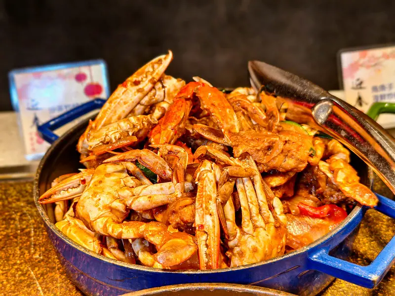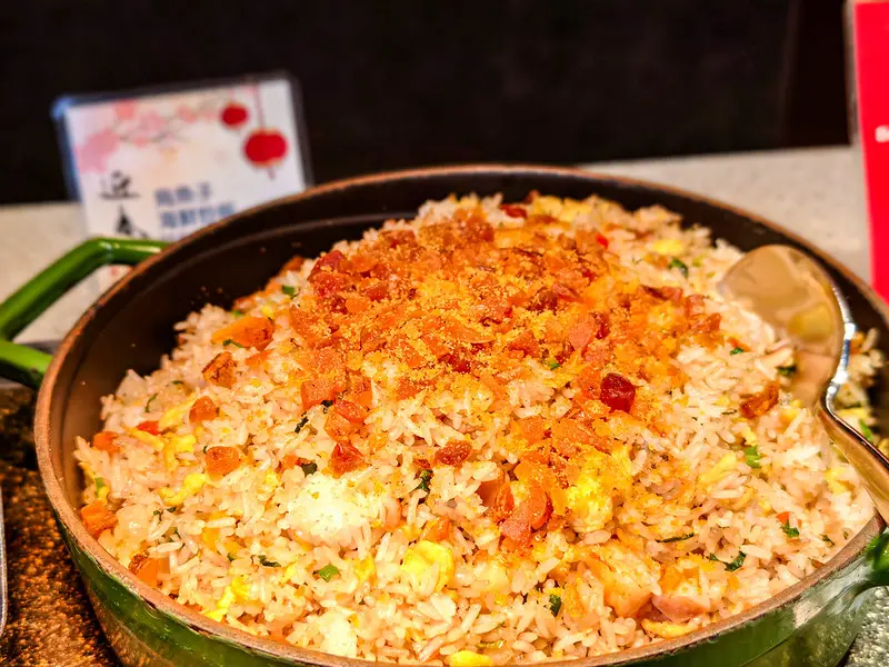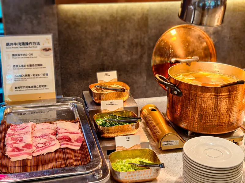 肉食區絕對是本次「中華好味」的主戰場。除了必拿的「爐烤牛排」,外皮焦香、內裡粉嫩多汁,單吃原味就非常迷人外,這次最推薦的是「現沖牛肉湯」。將薄如蟬翼的生牛肉片放入碗中,沖入滾燙的高湯,肉片瞬間熟成粉紅色,湯頭因加入了蘿蔔而顯得特別鮮甜,讓人忍不住一碗接一碗。此外,配合主題推出的中式大菜如烏魚子海鮮炒飯、沙茶炒螃蟹等,道道誠意十足,口味相當道地。