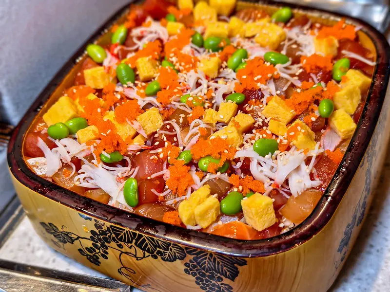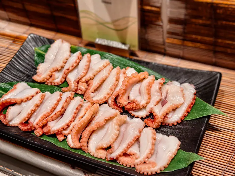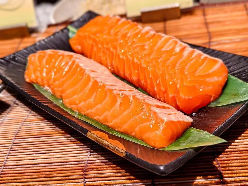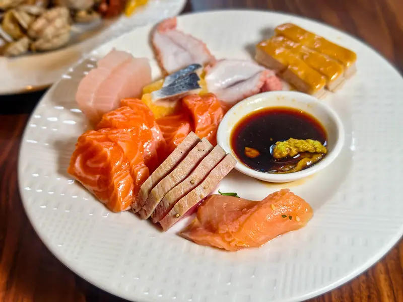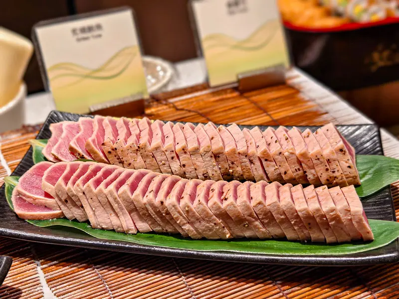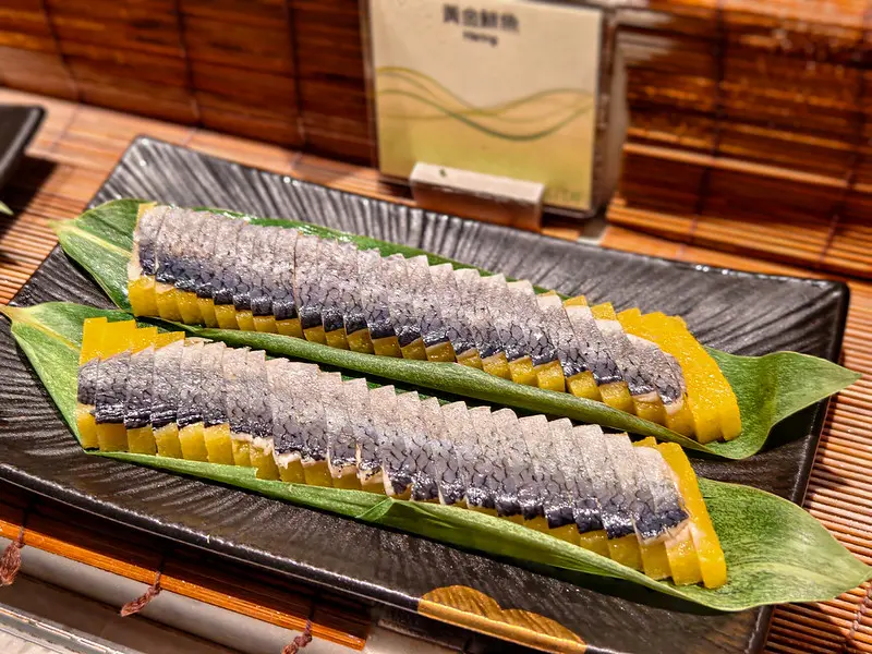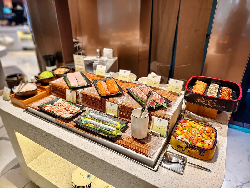 挾帶著日系飯店的背景,這裡的日料區水準一直相當穩定。生魚片提供了鮭魚、鮪魚、旗魚與黃金鯡魚等基本盤,其中鮭魚的表現最為亮眼,油花分布均勻,切片厚度適中,且溫控做得非常好,入口軟嫩鮮美,完全沒有退冰不全的碎冰感。握壽司的醋飯比例恰當,米飯 Q 彈微酸,手捲的海苔烤得酥脆,建議拿到後立刻食用,享受清爽脆口的最佳風味。