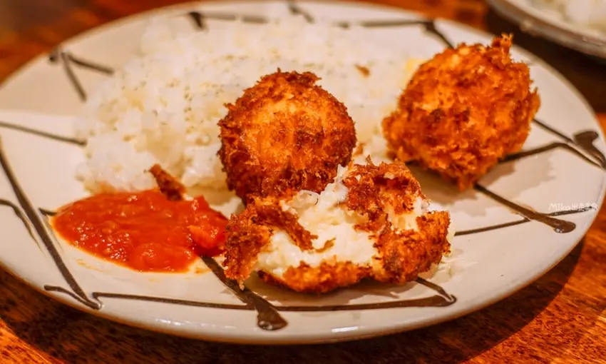 如果不吃牛肉,推薦嘗試這道「香住蟹奶油可樂餅」。選用鄰近鳥取縣的兵庫縣特產「香住蟹」作為主角,將鮮甜的蟹肉融入濃郁的奶油餡中。經過高溫油炸後,外皮呈現金黃酥脆的口感,咬下去會發出清脆的聲響,內餡則是綿密滑順、充滿海洋鮮味的蟹肉奶油。鮮甜與鹹香的比例拿捏得恰到好處,搭配酥脆的餅皮,口感層次豐富,是一道大人小孩都會喜歡的美味料理。