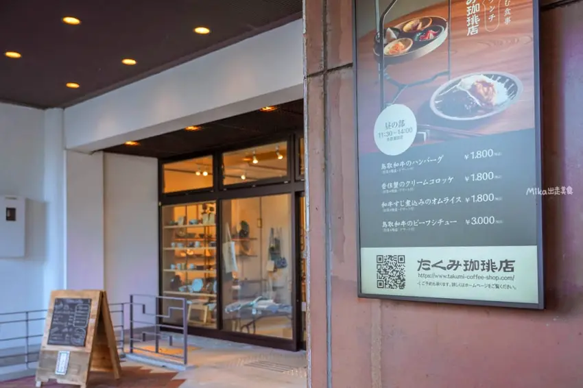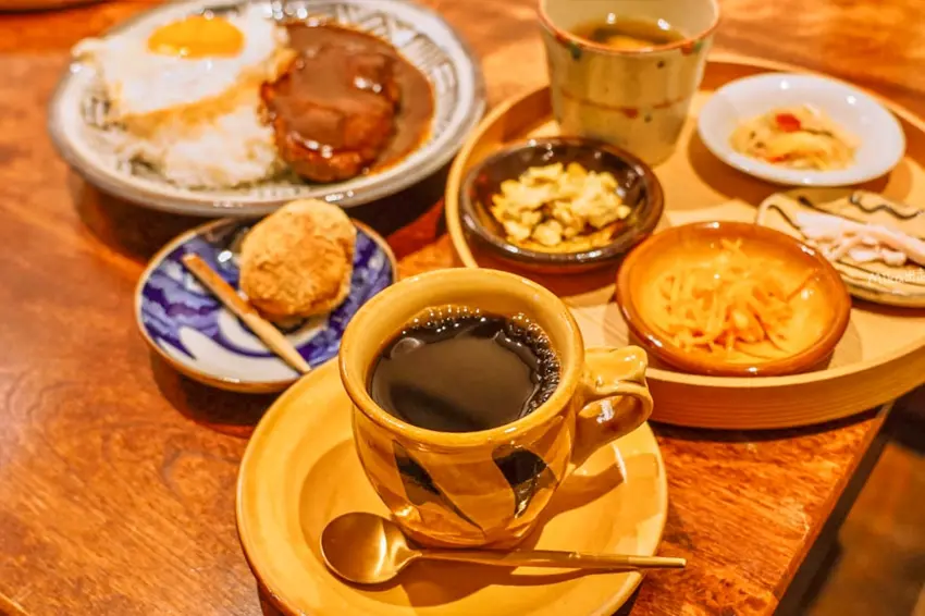 鳥取站「たくみ珈琲店」將民藝融入生活。必吃鳥取和牛漢堡排與香住蟹可樂餅,用在地陶器品味美食與藝術的完美結合。