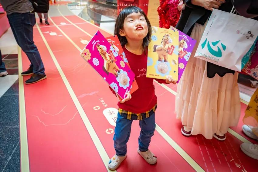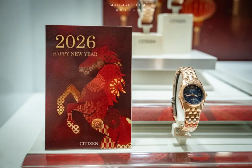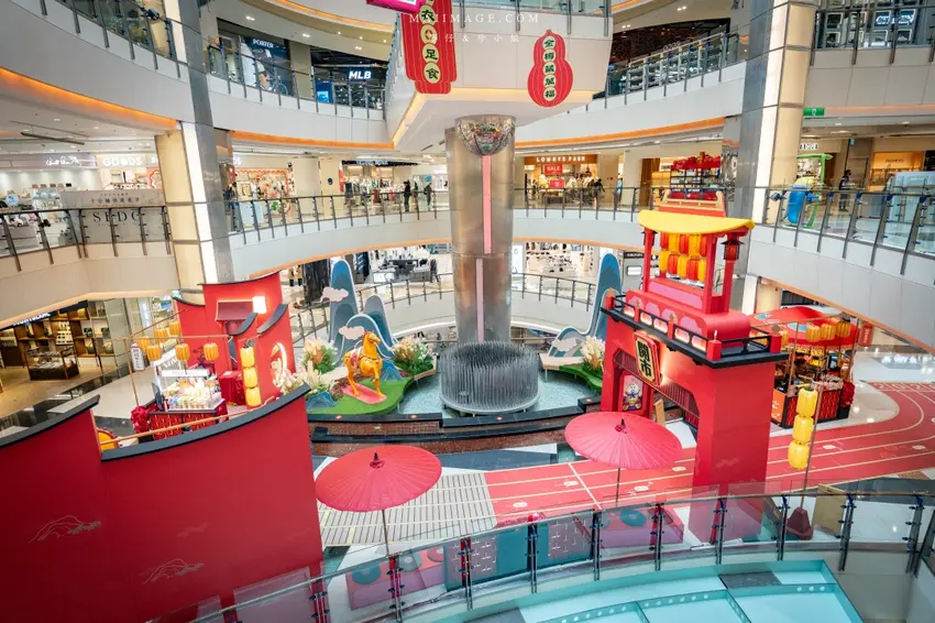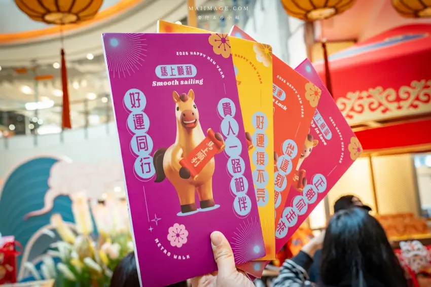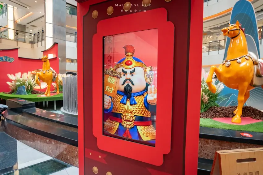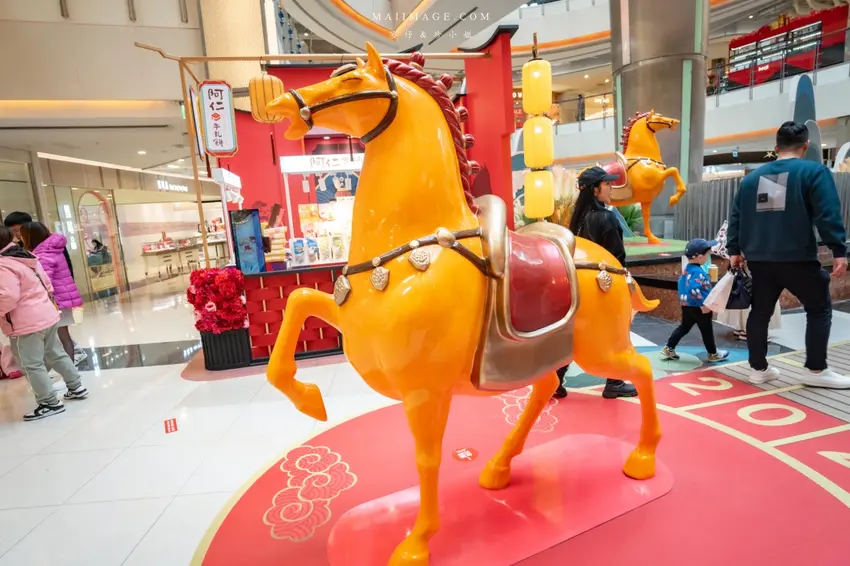今年大江購物中心的一樓中庭裝置藝術可說是誠意滿滿,以郎世寧的百馬圖為發想靈感,模擬出遼闊的草原牧場背景。現場巨大的「2026」字樣結合了賽馬跑道意象,象徵著時間的奔騰與新年的到來。最吸睛的莫過於仿古設計的「開市」城門與兩側的門神,充滿了唐代長安城的繁華氛圍。現場還設置了互動式的抽籤小遊戲,讓遊客在逛街之餘也能試試手氣。建議大家可以多走幾層樓,從二樓或三樓往下俯瞰,更能將整座萬馬奔騰的壯麗景致盡收眼底,隨手一拍都是充滿年味的賀歲大片。
