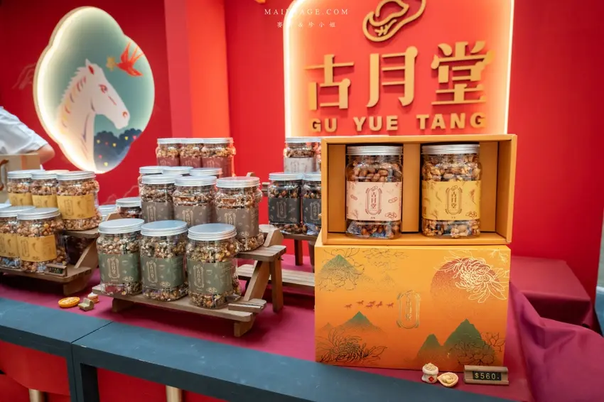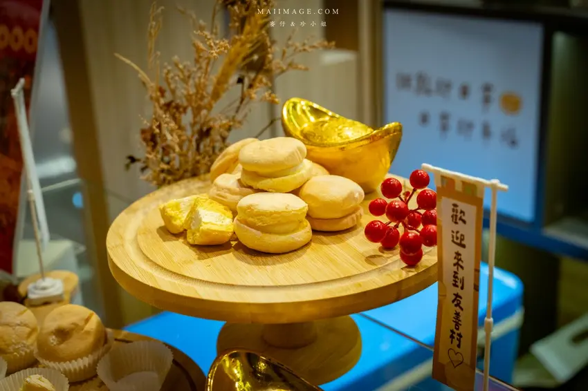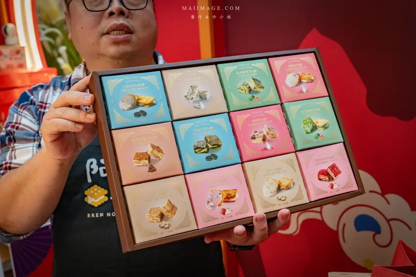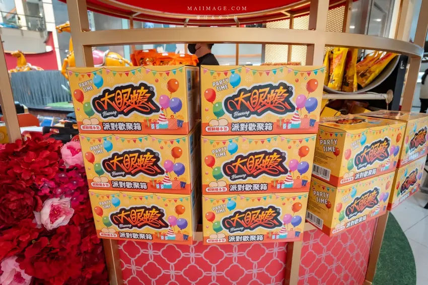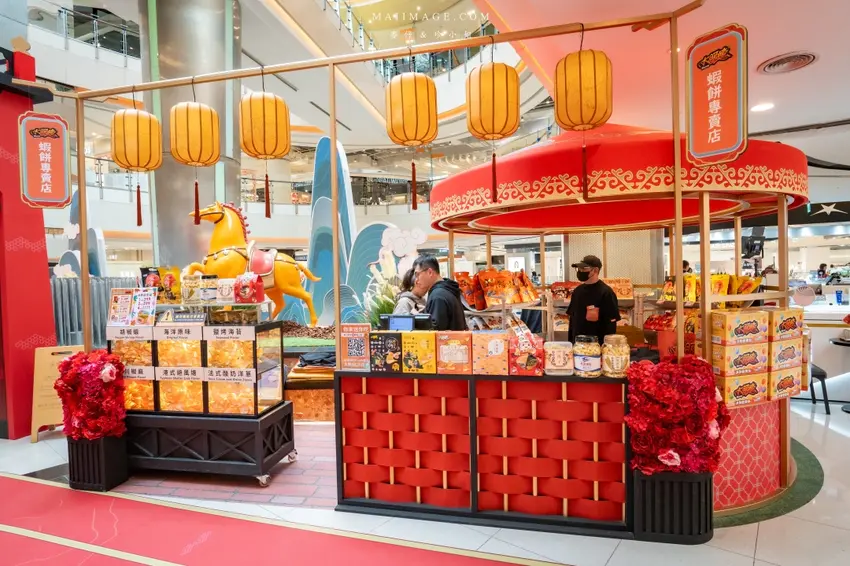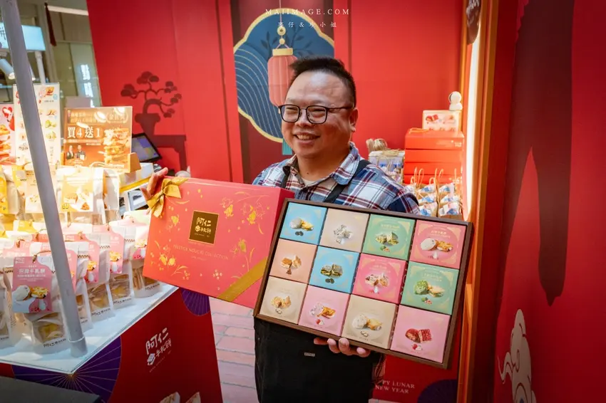 拍完照當然要逛逛熱鬧的賀歲市集,這次集結了多家人氣伴手禮品牌,讓辦年貨變得輕鬆又方便。知名的「阿仁牛軋餅」推出了多款精美禮盒,主打軟 Q 不黏牙的口感,季節限定的草莓與鳳梨口味更是搶手貨。「大眼蝦」的蝦片分享箱則是追劇神器,鹹蛋黃與肉鬆口味鹹香酥脆。還有傳承四代的「古月堂」花生糖,口感香酥不黏牙,長輩小孩都喜歡。喜歡甜點的朋友則不能錯過「友善村幸福烘焙所」的台式馬卡龍,外酥內軟的蛋糕口感搭配減糖內餡,吃起來清爽無負擔,是年節送禮的最佳選擇。