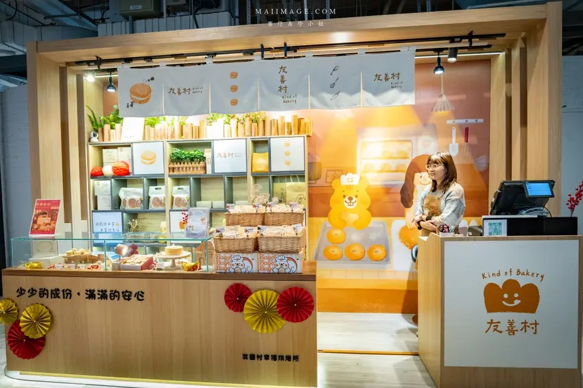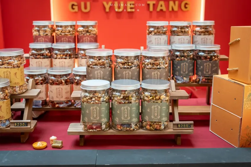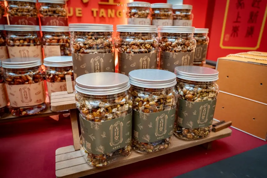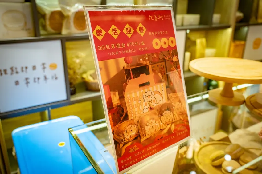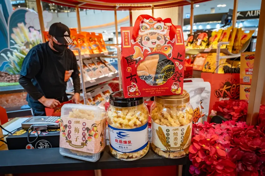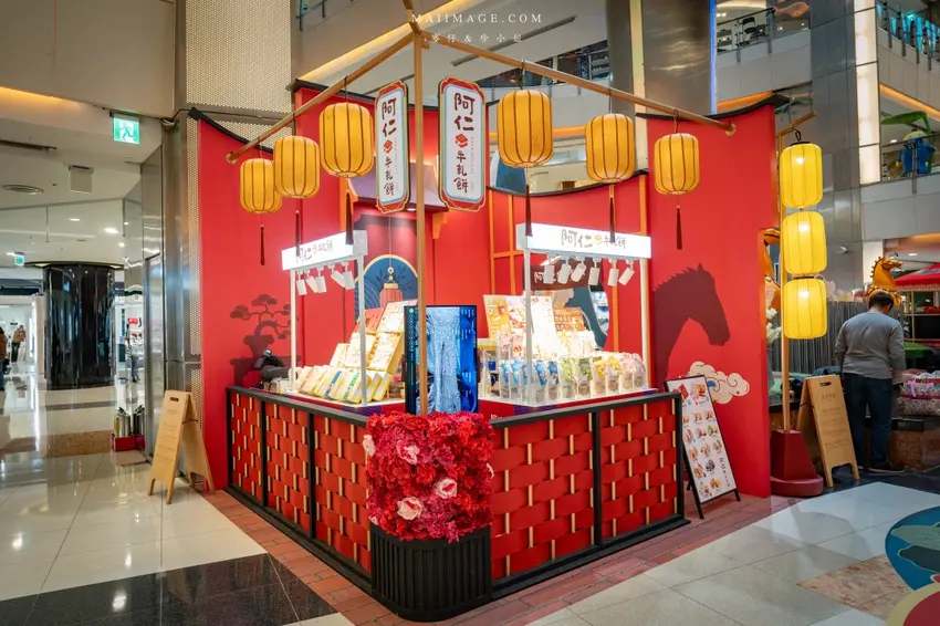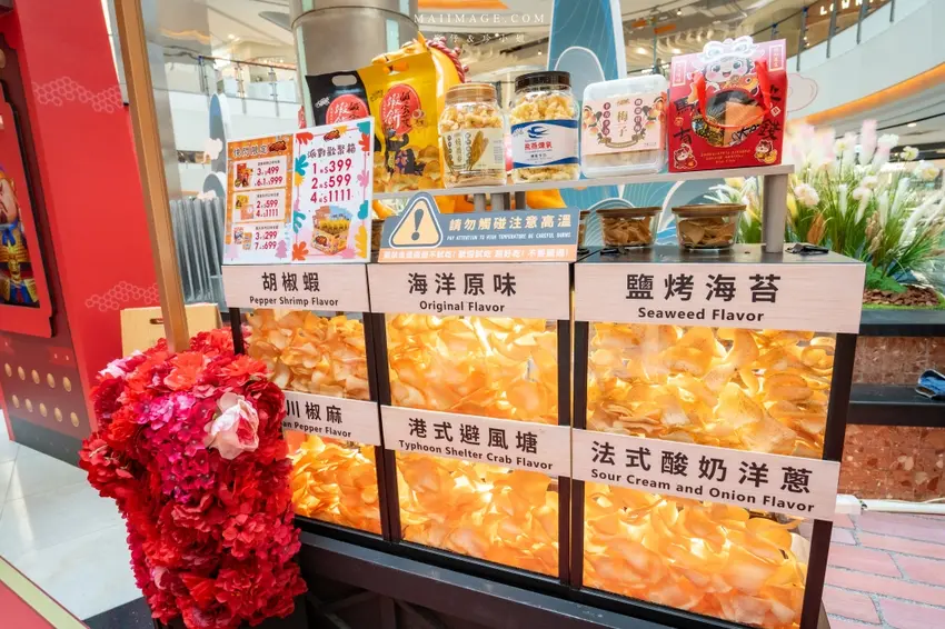 拍完照當然要逛逛熱鬧的賀歲市集,這次集結了多家人氣伴手禮品牌,讓辦年貨變得輕鬆又方便。知名的「阿仁牛軋餅」推出了多款精美禮盒,主打軟 Q 不黏牙的口感,季節限定的草莓與鳳梨口味更是搶手貨。「大眼蝦」的蝦片分享箱則是追劇神器,鹹蛋黃與肉鬆口味鹹香酥脆。還有傳承四代的「古月堂」花生糖,口感香酥不黏牙,長輩小孩都喜歡。喜歡甜點的朋友則不能錯過「友善村幸福烘焙所」的台式馬卡龍,外酥內軟的蛋糕口感搭配減糖內餡,吃起來清爽無負擔,是年節送禮的最佳選擇。