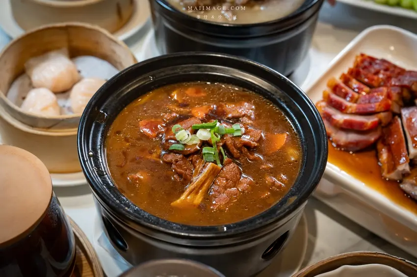 除了大菜,檀島的點心類表現也相當精彩。招牌的「極品蛋塔」擁有 192 層酥皮,口感鬆化蛋香濃郁;「流金菠蘿包」則夾入了鹹香拉絲的起司,邪惡又美味。造型可愛的「一本萬荔珠」外型酷似荔枝,內餡是彈牙的蝦肉,還能噴上荔枝酒增添香氣。喜歡重口味的朋友推薦嘗試「沙嗲牛肉粉絲煲」,濃郁的沙嗲醬汁帶有微辣口感,包裹著滑嫩牛肉與寬粉,超級下飯。最後再來一杯酸甜解膩的「美聲紫蘇飲」或「烏梅洛神」,為這頓豐盛的港式饗宴畫下完美的句點。