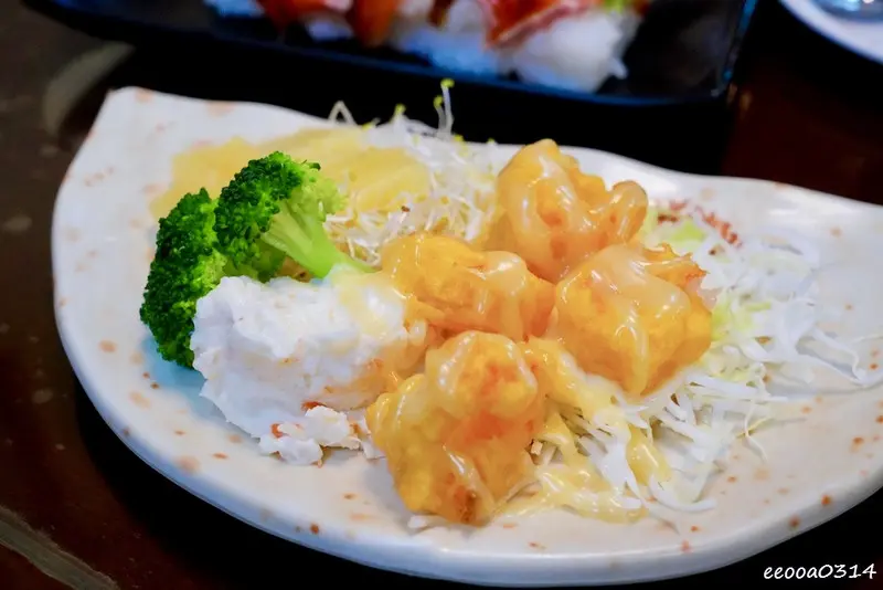 炸得金黃的蝦球裹上滿滿美乃滋,小朋友很喜歡,搭配鳳梨跟生菜,爽口解膩。