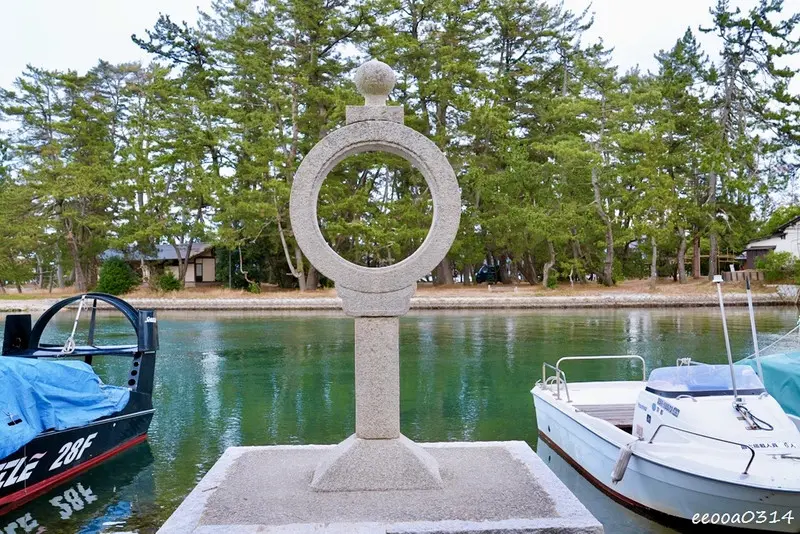 在通往海邊的方向,可以看到一座造型特殊的石造「智慧輪」(知恵の輪)。