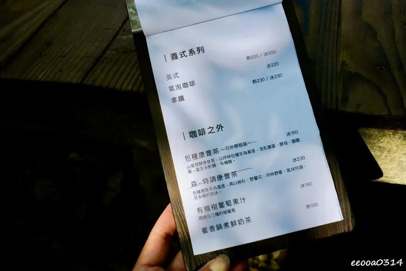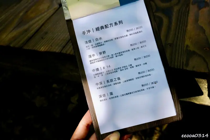 由淺焙至深焙共五種選擇,熱沖$200、冷沖+20,這樣一杯很適合森林裡慵懶的午後。