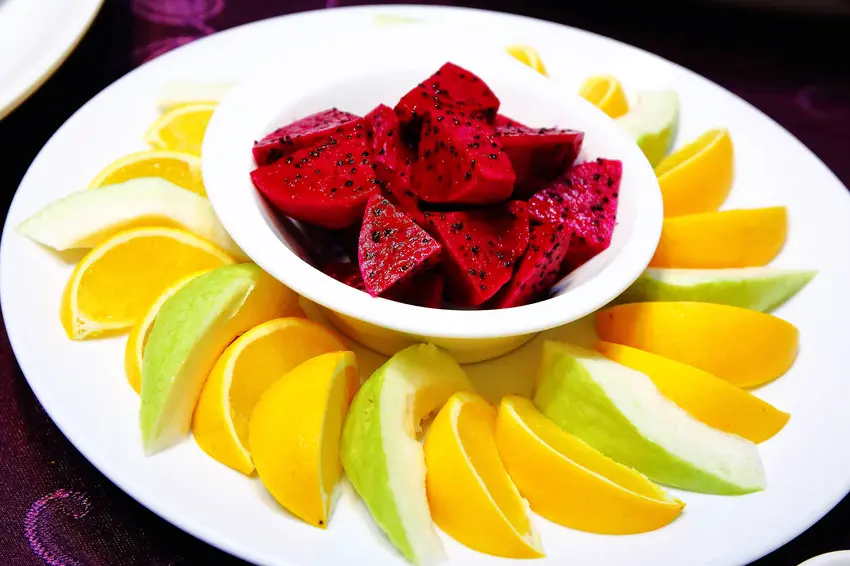 嚴選當季新鮮水果,色彩繽紛,有紅肉火龍果、柳丁、芭樂