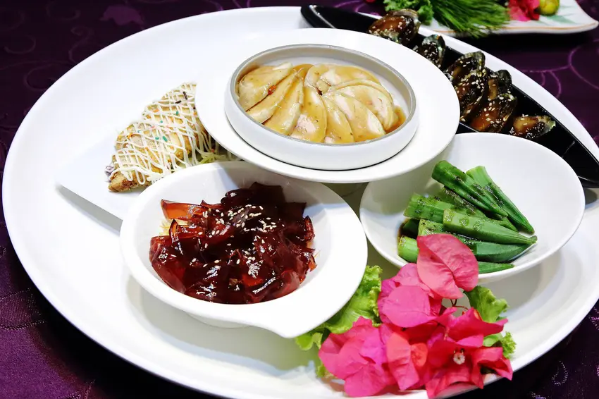 九孔、土雞、魚卵沙拉、涼拌曼波魚皮、秋葵