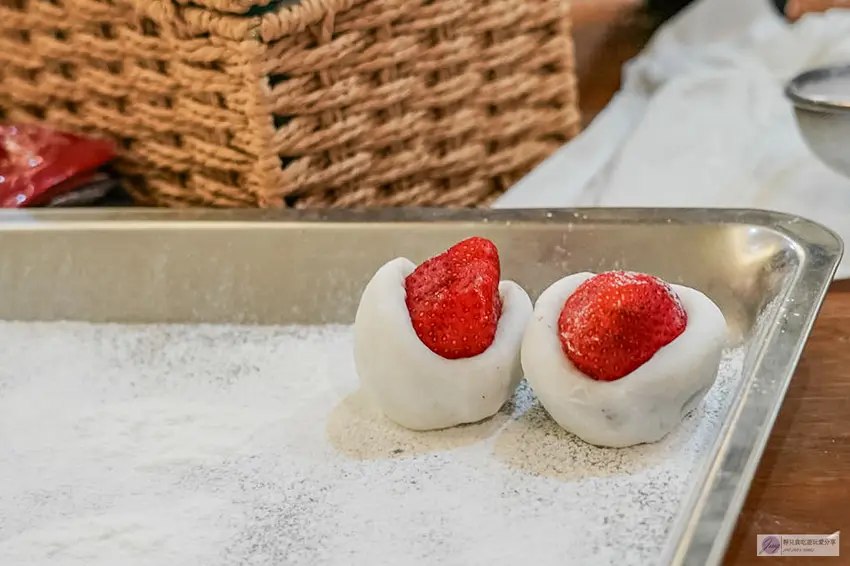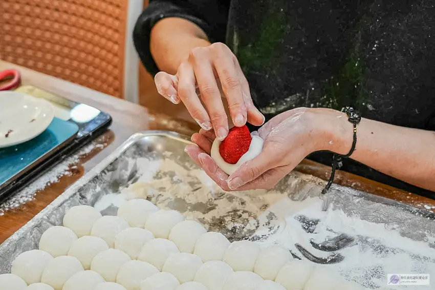 這裡的草莓大福之所以有名,全靠老闆娘的手工堅持。運氣好的話還能現場看到製作過程,大福皮並非使用現成品,而是需要事先切成一顆顆的形狀,再手工包入紅豆餡與新鮮草莓。店家嚴選的大湖草莓都經過仔細清洗,現場試吃更是香甜多汁。紅豆餡也是店家親自熬煮,保留了紅豆的顆粒感且甜度適中。看著一顆顆圓滾滾的大福在手中成形,過程超級療癒,也讓人對這份手作的溫度更加期待。