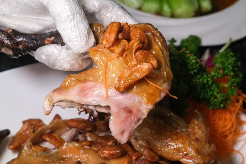 ▼每桌必點的招牌鹽焗雞,擁有誘人的金黃色澤,使用新鮮雞隻現烤烹飪,加入大量的酥炸黃金蒜頭,手撕的時候還在滴汁有夠狂,肉質飽滿香甜軟嫩好吃,外皮帶有過癮的酥脆度!