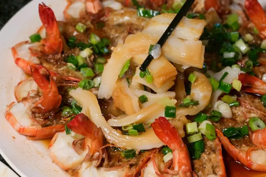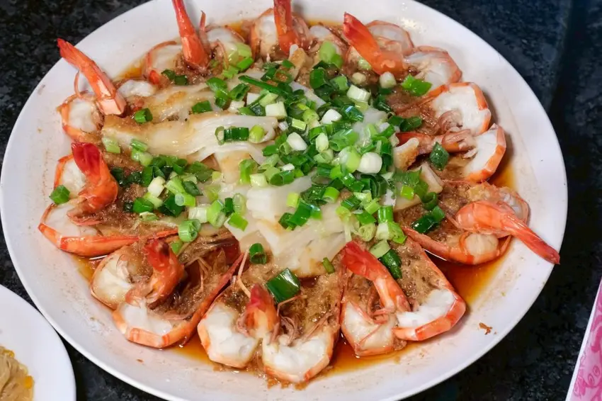 ▼豪華登場的蒜茸蒸草蝦,使用大尾的草蝦搭配粄條和蒜茸清蒸,粄條吸滿了醬汁超過癮,吸吮蝦肉時有著濃郁蒜香,香氣滿溢越吃越涮嘴!