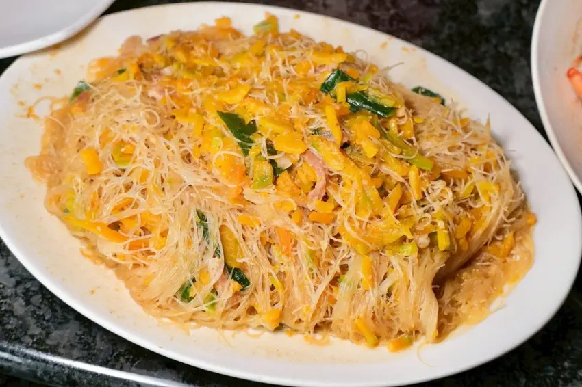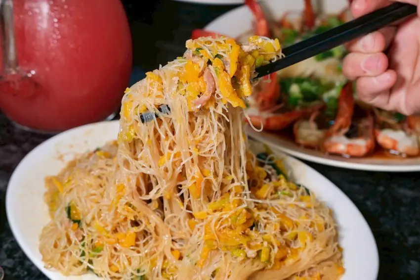 ▼這道金瓜米粉看起來平凡,吃起來卻很有料欸,把大量的南瓜絲跟配料炒熟炒香,米粉吸收南瓜精華吃起來很入味~