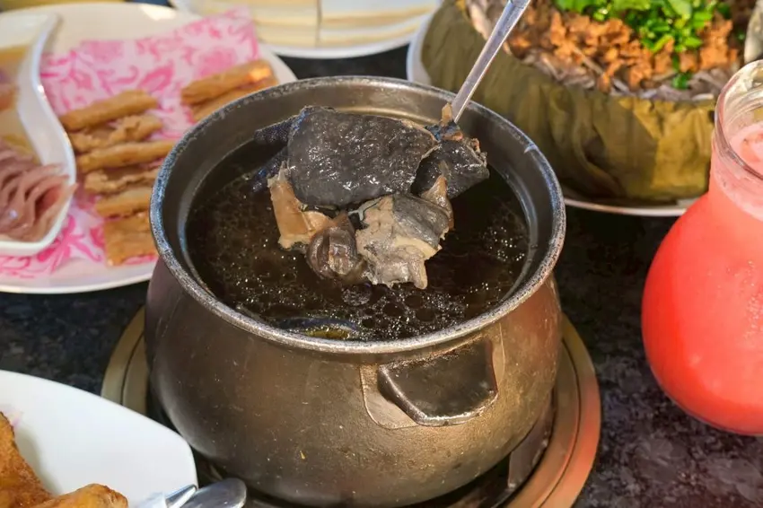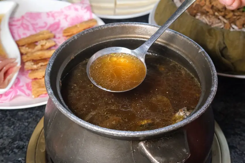 ▼冬天超暖心的黑蒜頭雞湯,蒜頭熬煮融入至湯頭當中,湯頭醇厚有韻味,迷人蒜香在口中襲來,還能撈到超大量的烏骨雞,肉質彈牙好咬,完全不會咬不動,圓桌中間還有爐火可以持續加熱!