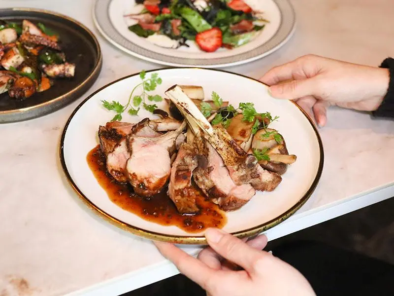 全場最讓人驚豔、也是來店必點的招牌菜,莫過於這道「法式烤全雞」。這絕不是隨便烤一隻雞那麼簡單,前置作業耗時費工,光是將松露奶油小心翼翼地塞進雞皮與雞肉之間,就是一門真功夫。表皮刷上蜂蜜醋水後,還需風乾整整五天才能進烤箱,因此想吃務必提前預訂!出爐的烤雞外皮薄脆如紙,切開後肉汁四溢,奶油與松露的香氣完美融入每一絲雞肉中。不靠重口味醬料取勝,單憑繁複工法就讓人深深折服。