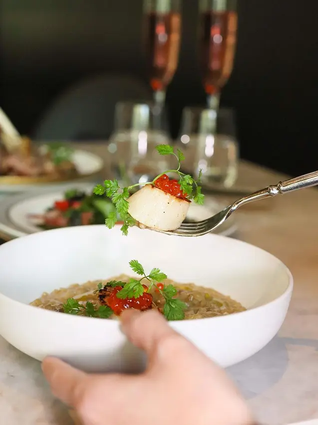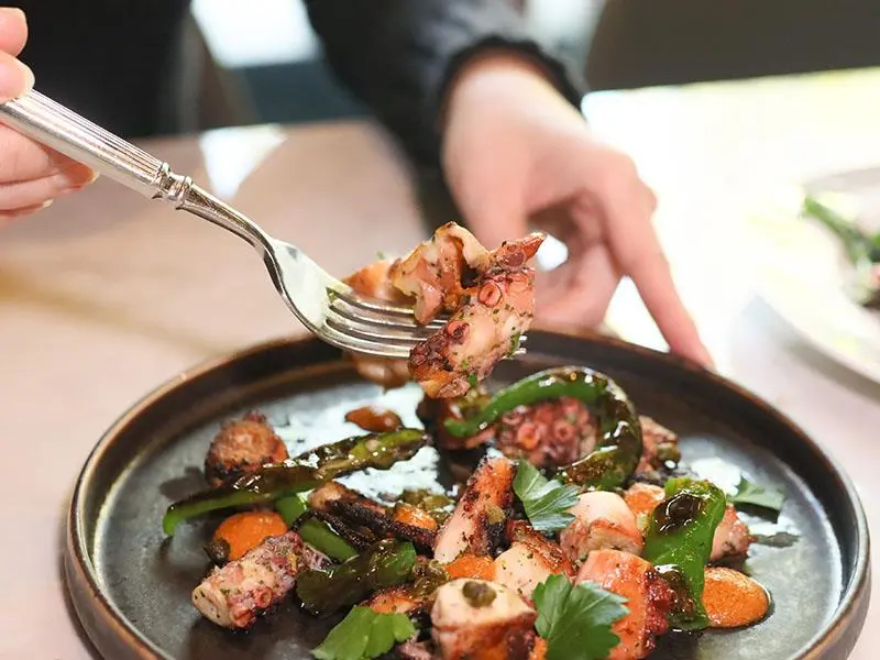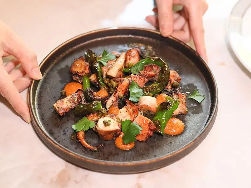 為迎合台灣人的飲食習慣,這道「海鮮燉飯」主廚特別將米心感稍微降低,保留了些許咀嚼的層次。湯底以蛤蜊高湯為基礎,加入生蠔肉醬與初榨橄欖油燉煮,一入口就是濃郁奔放的海味。上方點綴著兩顆巨大干貝與晶瑩剔透的鮭魚卵,鹹鮮交織的味道厚實卻不會給胃帶來負擔。另一道「碳烤章魚」同樣出色,章魚烤得軟嫩恰到好處,搭配以巴西里、檸檬皮與大蒜調製的類青醬,檸檬的酸香氣息極致迷人,非常適合作為小菜。