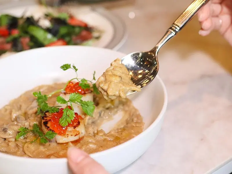 看似簡單的沙拉端上桌,視覺立刻被鮮豔的草莓給吸引,但這道菜真正的靈魂其實是中間那顆「布拉塔起司」。這款源自義大利的經典起司,外層是由充滿彈性的莫札瑞拉起司包覆,切開後奶香四溢。搭配上主廚特調的巴沙米克油醋、鹹香的煙燻火腿與當季新鮮水果,厚實的奶香在口中化開卻絲毫不膩口。微酸微甜的果香與起司完美融合,比例抓得極為精準,作為開胃前菜真的非常清爽解膩,讓人胃口大開。