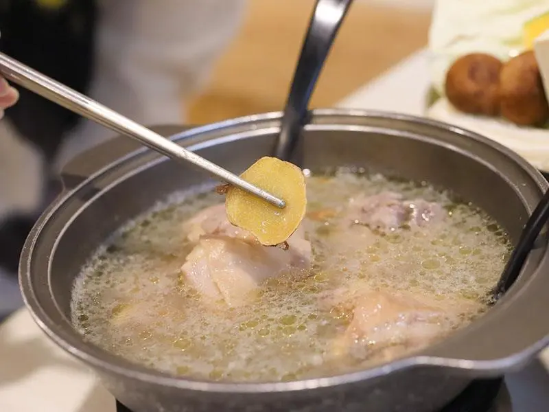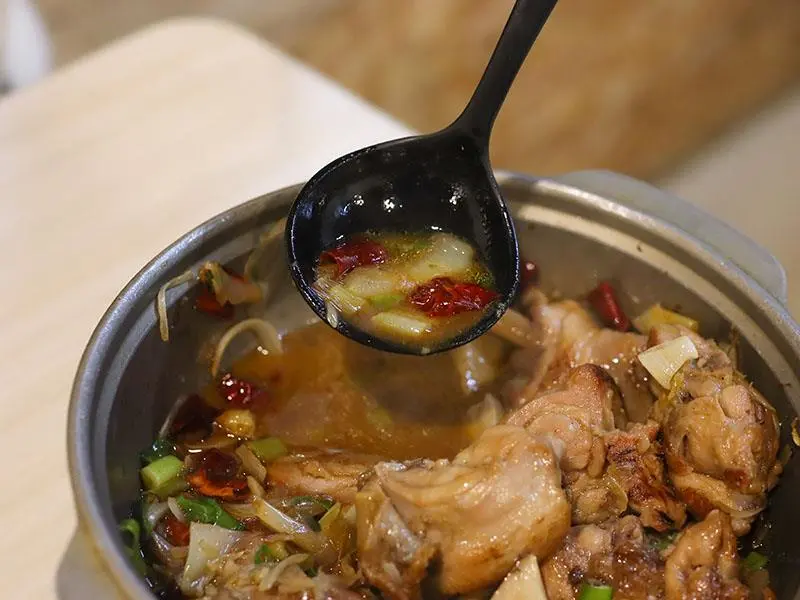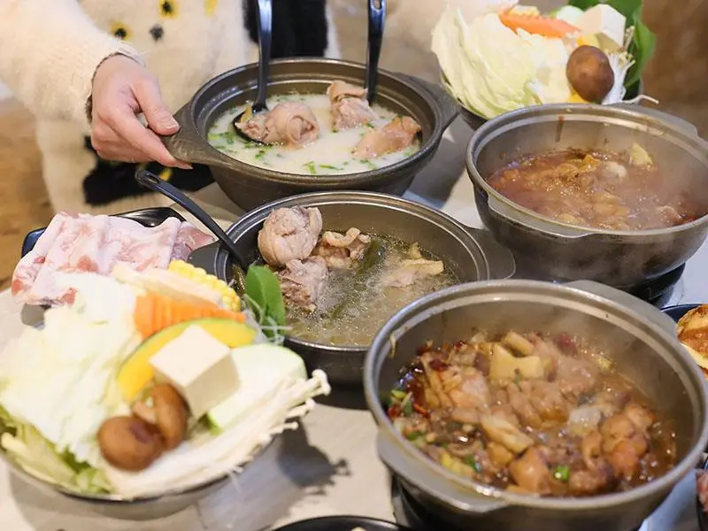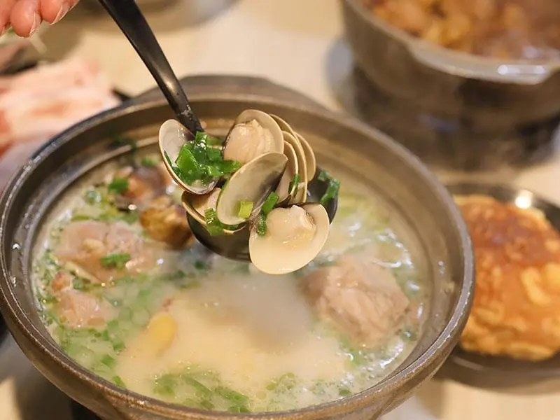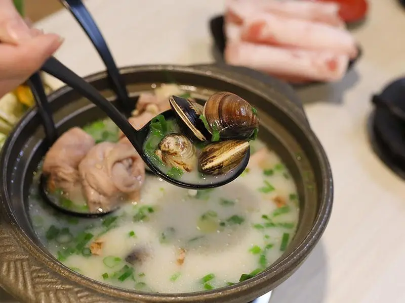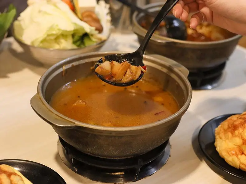如果你偏好喝熱湯,店內的經典台式湯底也絕不會讓你失望。「蒜香蛤蜊雞鍋」毫不手軟地加入滿滿青蔥,大顆飽滿的蛤蜊讓湯頭鮮甜無比,蒜香溫和不刺激,而是隨著溫度慢慢堆疊出層次,喝起來清爽卻不單薄。另一款「剝皮辣椒雞鍋」則是越喝越順口的代表,湯底加入薑片熬煮,辛口中帶點甘甜,溫和卻帶有迷人後勁。當雞肉吸飽了微辣的湯汁,辣度停留在最剛好的狀態,一口熱湯下肚,從胃裡暖到全身,是冷天裡最溫暖的慰藉。