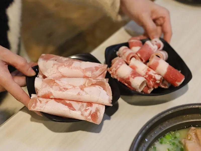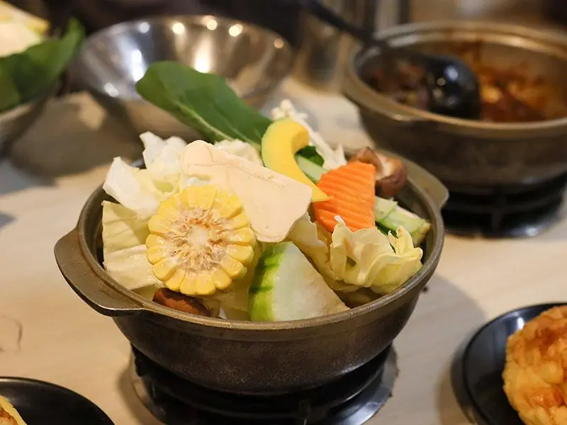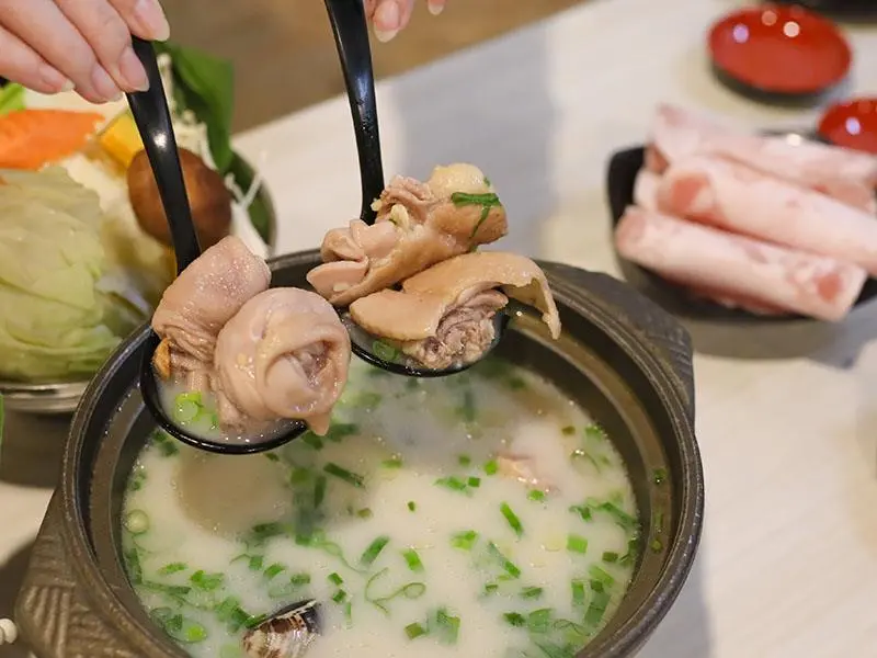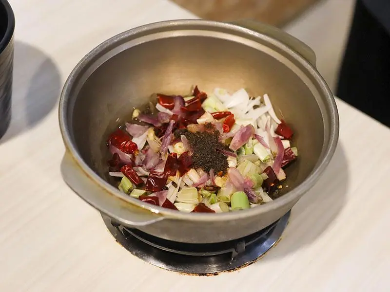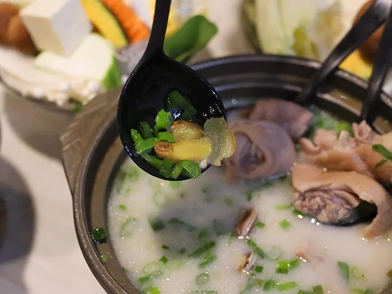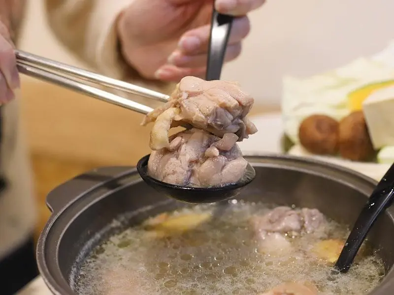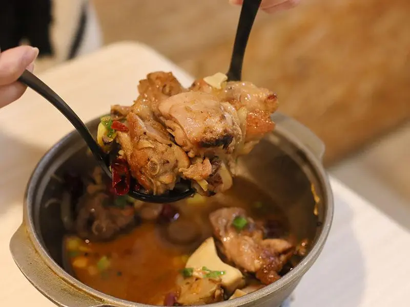 如果你偏好喝熱湯,店內的經典台式湯底也絕不會讓你失望。「蒜香蛤蜊雞鍋」毫不手軟地加入滿滿青蔥,大顆飽滿的蛤蜊讓湯頭鮮甜無比,蒜香溫和不刺激,而是隨著溫度慢慢堆疊出層次,喝起來清爽卻不單薄。另一款「剝皮辣椒雞鍋」則是越喝越順口的代表,湯底加入薑片熬煮,辛口中帶點甘甜,溫和卻帶有迷人後勁。當雞肉吸飽了微辣的湯汁,辣度停留在最剛好的狀態,一口熱湯下肚,從胃裡暖到全身,是冷天裡最溫暖的慰藉。
