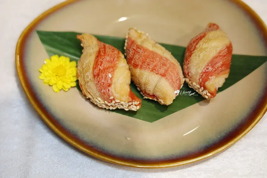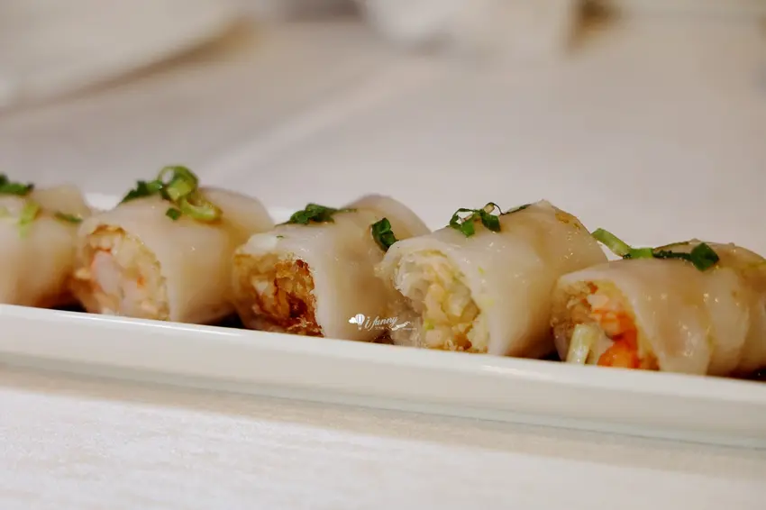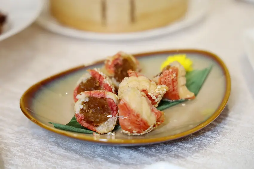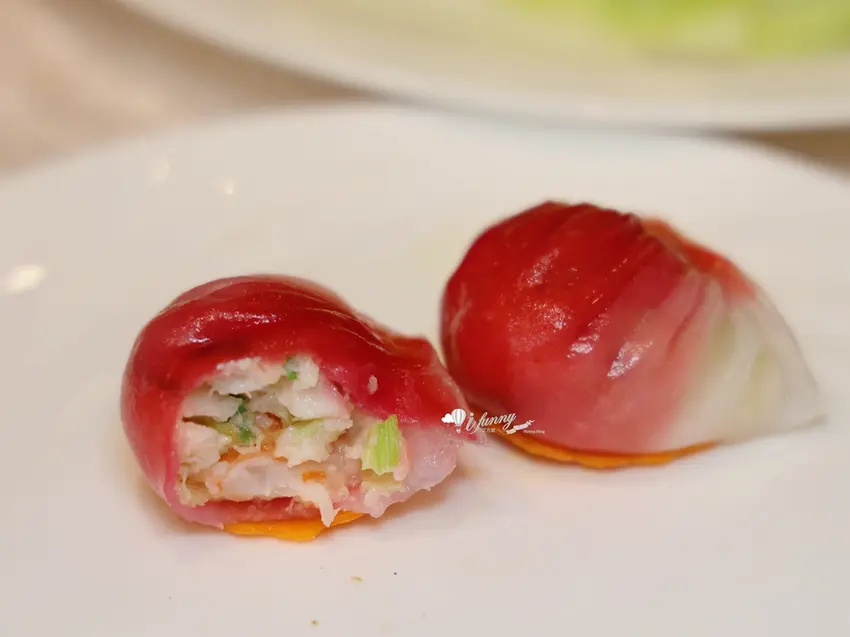 港式點心更是考驗師傅的手工技藝。外型精巧的「海螺酥」宛如真實貝殼,內餡包裹鳳梨與檸檬的酸甜組合,外皮酥鬆細緻,是視覺與味覺的雙重享受。視覺討喜的「鱈魚餃」以甜菜根染色的水晶皮包覆,鱈魚與草蝦內餡清爽鮮甜。另一款「鮑魚荔燒賣」更顯奢華,頂端放上一整顆滷製入味的原隻小鮑魚,口感Q彈有韌性,搭配緊實多汁的鮮蝦豬肉餡,每一口都充滿了濃郁的海味與大大的滿足感。