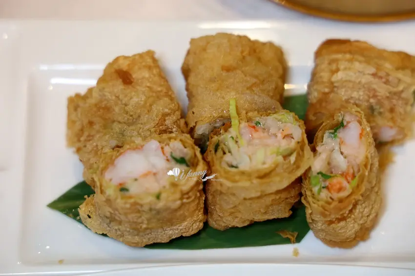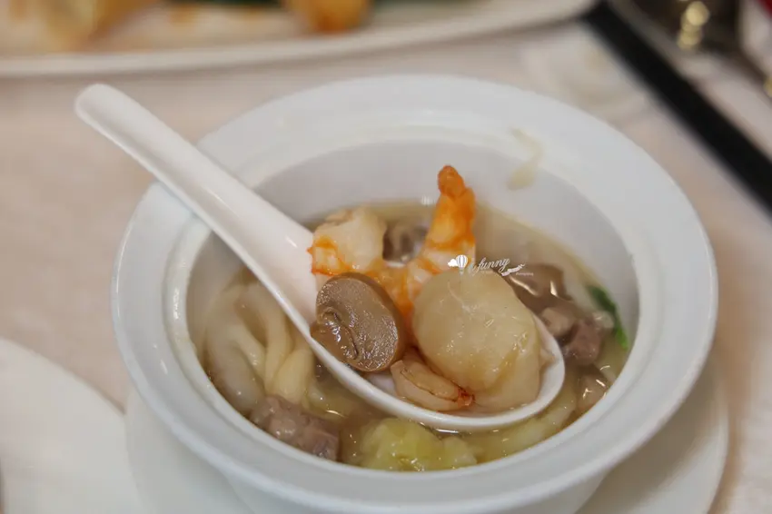 點心類還有令人驚豔的「千層蘿蔔絲酥餅」,擁有薄如蟬翼的酥殼,帶有濃郁奶香卻不油膩,內餡的蘿蔔絲濕潤清甜,底部沾滿白芝麻烘烤後更添堅果香氣。「上湯海皇灌湯包」的靈魂則在於那以金華火腿與老母雞熬煮的上湯,湯色清澈卻滋味甘醇。極薄的麵皮包裹住蝦仁與干貝等海鮮精華,與溫潤的膠質湯頭一同入口,堪稱一絕。每一道點心都展現了粵菜精緻的工藝,讓人回味無窮。