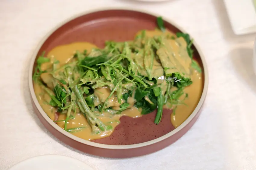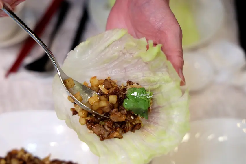 在烤鴨的吃法上,副主廚特別結合了自身的台南背景,獨創出微酸微甜的「關廟土鳳梨醬」。搭配脆皮嫩肉一同入口,不僅開胃更能有效解膩,讓這道經典料理多了一份創意的驚喜。烤鴨的第二吃是「生菜鴨鬆」,將鴨肉切丁與脆筍、蠔油、薑末大火快炒出鹹香,包入新鮮生菜中,口感層次豐富且清爽。第三吃則是「鴨架湯」,以烤鴨骨架熬煮出濃郁精華,加入豆腐、蒜苗與酸菜,湯頭鮮甜回甘,將整隻烤鴨的美味發揮得淋漓盡致。