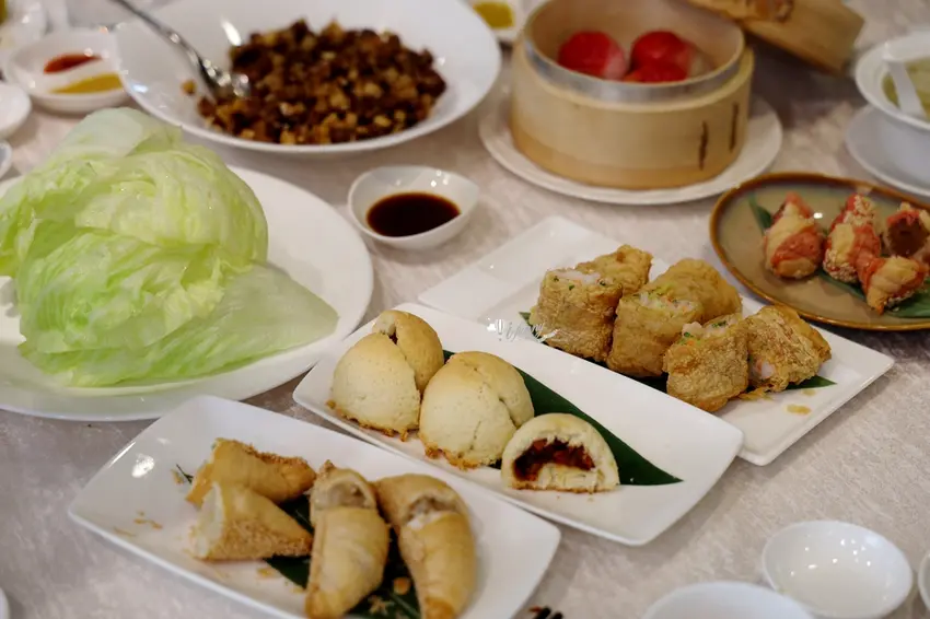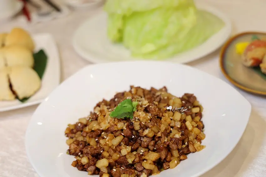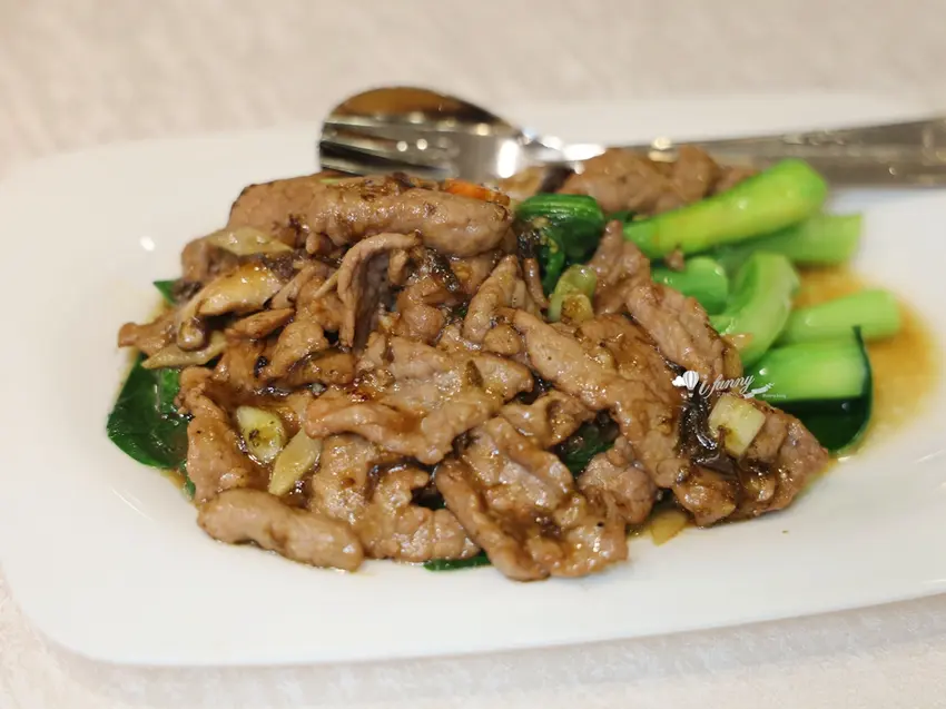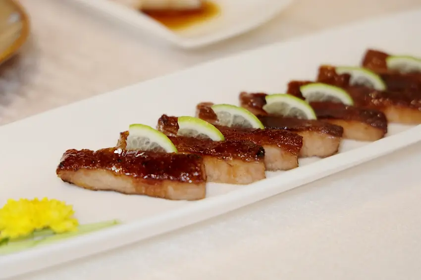 除了烤鴨,這裡的各式熱炒功夫菜也極具水準。「橄菜芥蘭炒牛肉」的牛肉入口極為滑溜軟嫩,芥蘭的爽脆與微苦被橄菜深層的鹹香完美中和,風味極具深度。另一道「xo醬蘆筍炒元貝」將干貝的軟嫩與蘆筍的脆口結合,搭配XO醬的鮮香微辣,豐富而不膩。當然還有必點的「脆皮叉燒」,外層薄脆糖衣與軟嫩多汁的肉質形成強烈對比,夾著檸檬片吃更能平衡油潤感,讓味道層次瞬間提升。