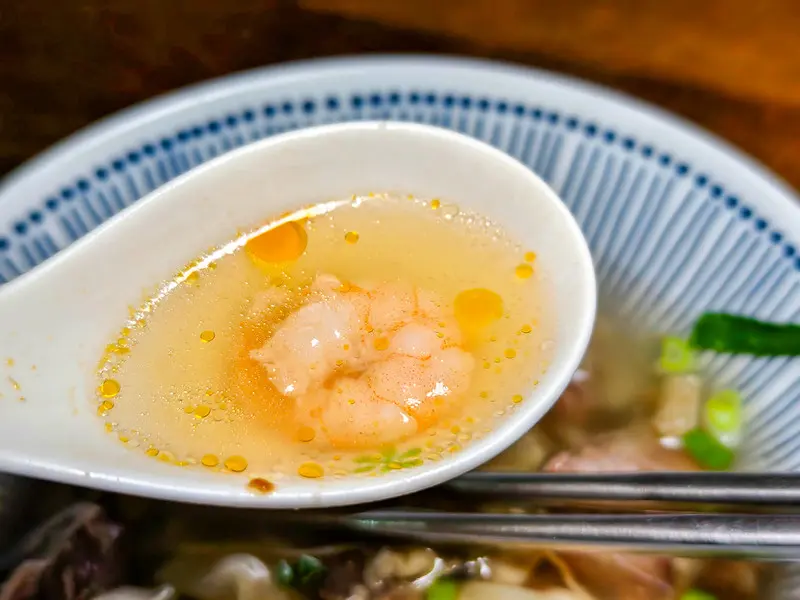 如果想要一次網羅店內的兩大招牌,點這碗「牛腩雲吞湯」準沒錯。這碗集大成的湯品裡,同時放滿了燉得軟爛入味的牛腩塊,以及碩大飽滿的鮮蝦雲吞。雲吞的皮極薄,在熱湯中輕盈漂浮卻不易破裂,咬開後能看到一整隻完整的鮮蝦,蝦肉鮮脆彈牙,與紮實的豬肉內餡比例拿捏得宜。湯頭同樣使用招牌的牛骨清湯,份量十足,光是吃料喝湯就極具飽足感,非常適合不想攝取太多澱粉的饕客細細品味。