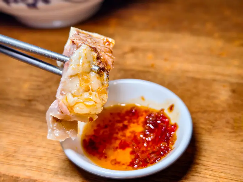 除了熱湯麵食,現點現炸的「炸鮮蝦雲吞」也是桌上不可或缺的亮點。剛上桌時呈現誘人的金黃色澤,外皮炸得喀滋作響,宛如餅乾般極致酥脆卻絲毫不含油。高溫油炸後,內餡依然保持著多汁的狀態,鮮蝦的甜味似乎也因此更加濃縮。沾上店家附上的酸甜泰式沾醬,不僅開胃更能完美解膩。這間基本功極其紮實的港式小店,絕對值得喜愛港味的朋友專程造訪,享受一頓道地又滿足的美味餐點。