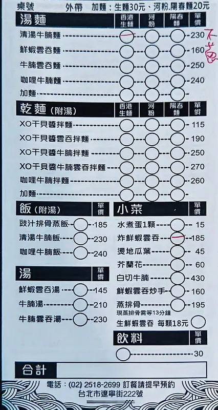 菜單的點餐邏輯相當簡單,主要以牛腩、雲吞等配料搭配不同的主食。強烈建議一定要選擇「香港生麵」,這才是這碗港式湯麵的真正靈魂。在台北要找到如此道地的港式生麵實屬難得,這裡完整保留了生麵特有的爽脆口感與淡淡的鹼水香氣,沒有為了迎合台灣口味而妥協。一口帶有嚼勁的細緻生麵,配上一口清甜甘醇的牛腩湯,兩者在口中交織出最正宗的風味,絕對讓澱粉控與港式料理愛好者大呼過癮。