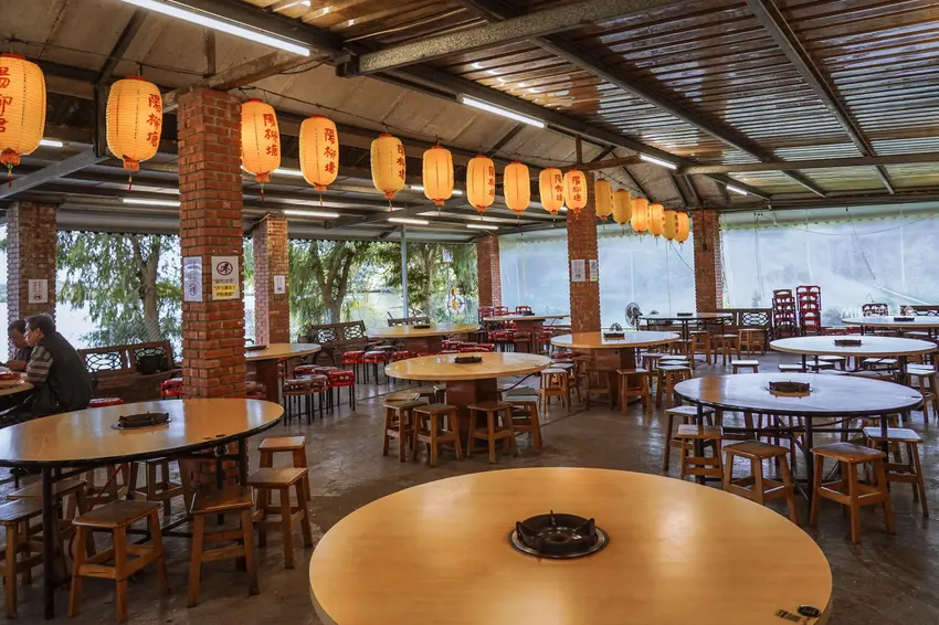 陽柳塘薑母鴨的地理位置確實有些隱密,位於新屋區高洲路的鄉間小路旁,周邊相當空曠,但也因此換來了極佳的停車便利性。餐廳緊鄰著美麗的楊柳埤塘,湖畔旁種滿了搖曳的楊柳樹,甚至還設有湖景第一排的半露天座位區。天氣晴朗時,這裡的夕陽黃昏景色非常迷人,邊賞湖景邊吃鍋別有一番風味。由於當天陰雨綿綿氣溫偏低,我們選擇了溫暖的室內座位,建議大家可以像我們一樣挑選平日下午的離峰時段前來,不僅能避開可怕的排隊人潮,更能悠閒地享受這片靜謐的湖畔風光。